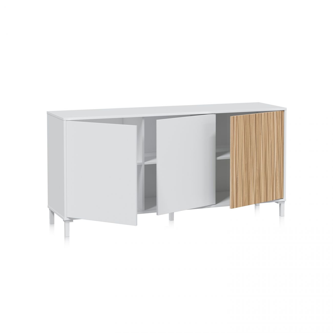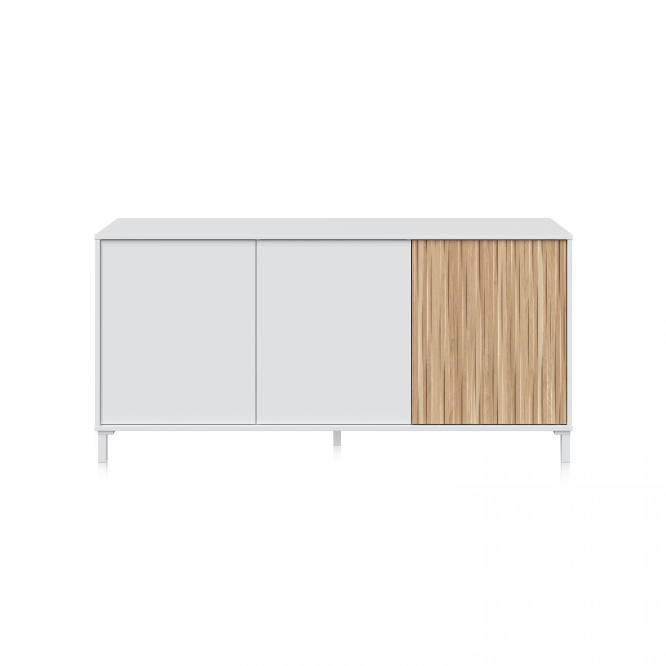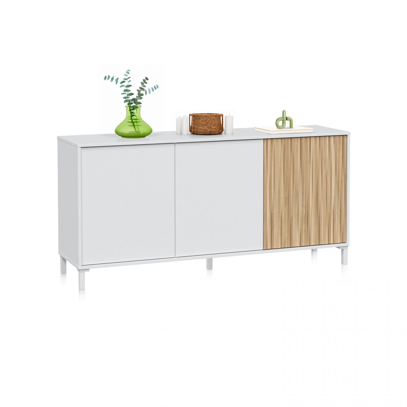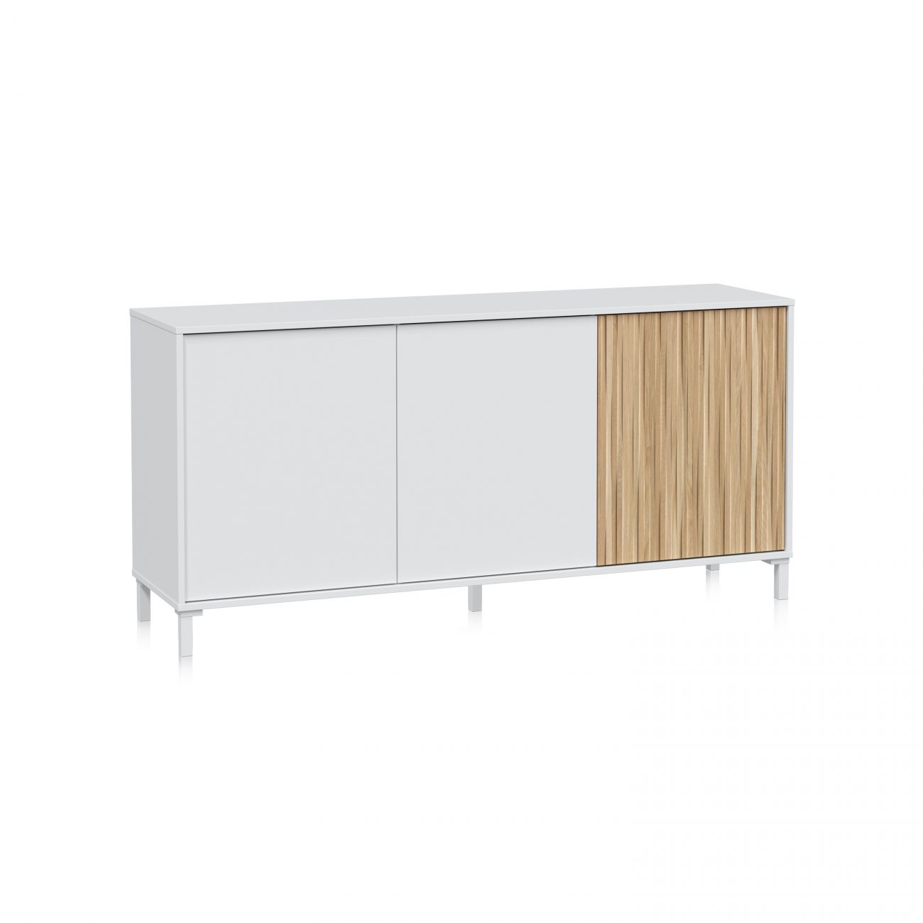 - Aparador de portas branco e madeira, um móvel de design minimalista que combina funcionalidade e estética