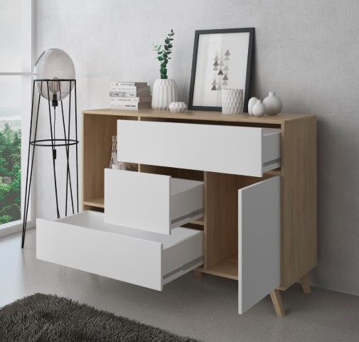 - Grande capacidade: inclui 3 gavetas, um armário e um compartimento aberto