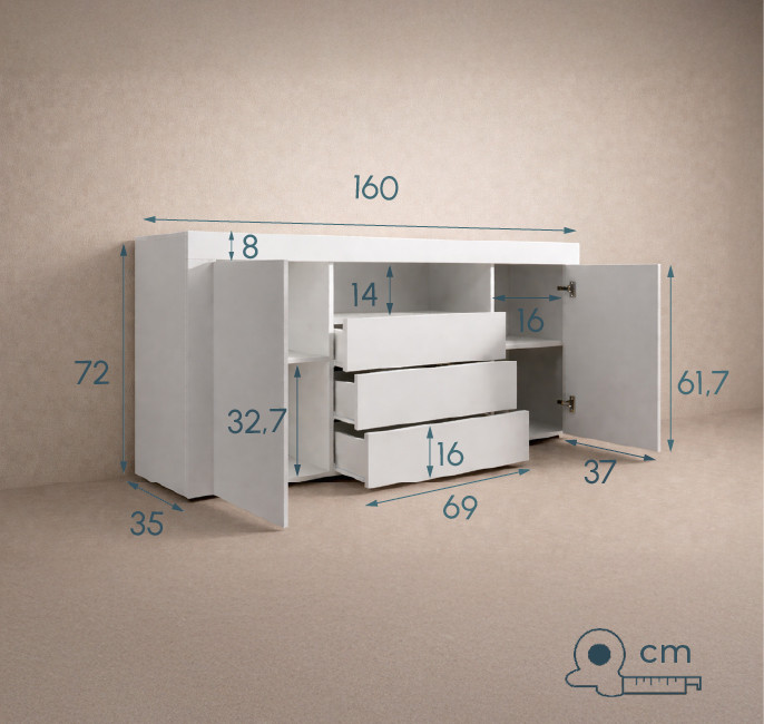 - 2 portas e 3 gavetas com fecho em sistema de push-click