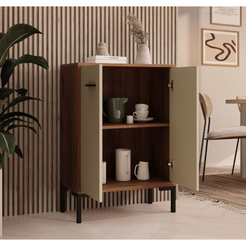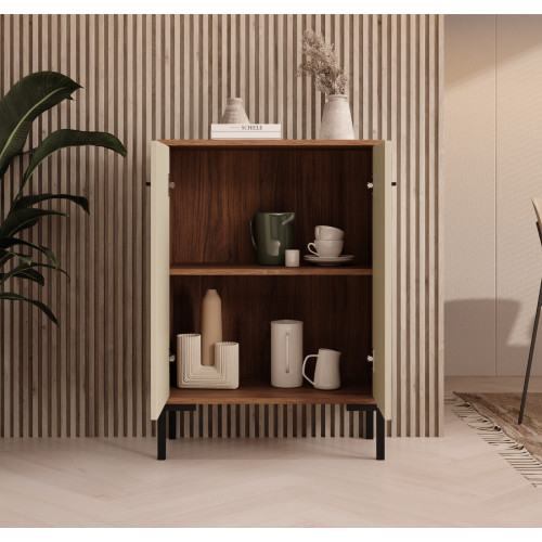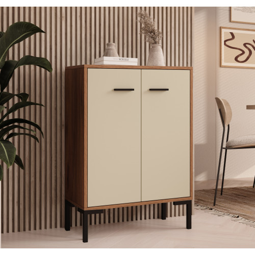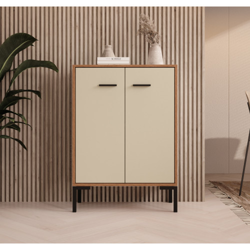 Um aparador moderno e multifuncional. Seu belo design o torna adequado para diversos ambientes. Você pode usá-lo como aparador para sala de estar ou cozinha, como estante, cômoda, mesa de apoio, mesa de corredor ou armário de escritório. Possui dois compartimentos com portas para guardar utensílios de cozinha, livros, pastas, roupas e muito mais. Sua ampla bancada permite acomodar itens decorativos, itens essenciais para manter à mão ou eletrodomésticos. Este móvel é especialmente adequado para espaços pequenos, onde a ordem e o bom planejamento do espaço são essenciais. Um móvel com design minimalista que será um complemento prático e decorativo para sua casa.
