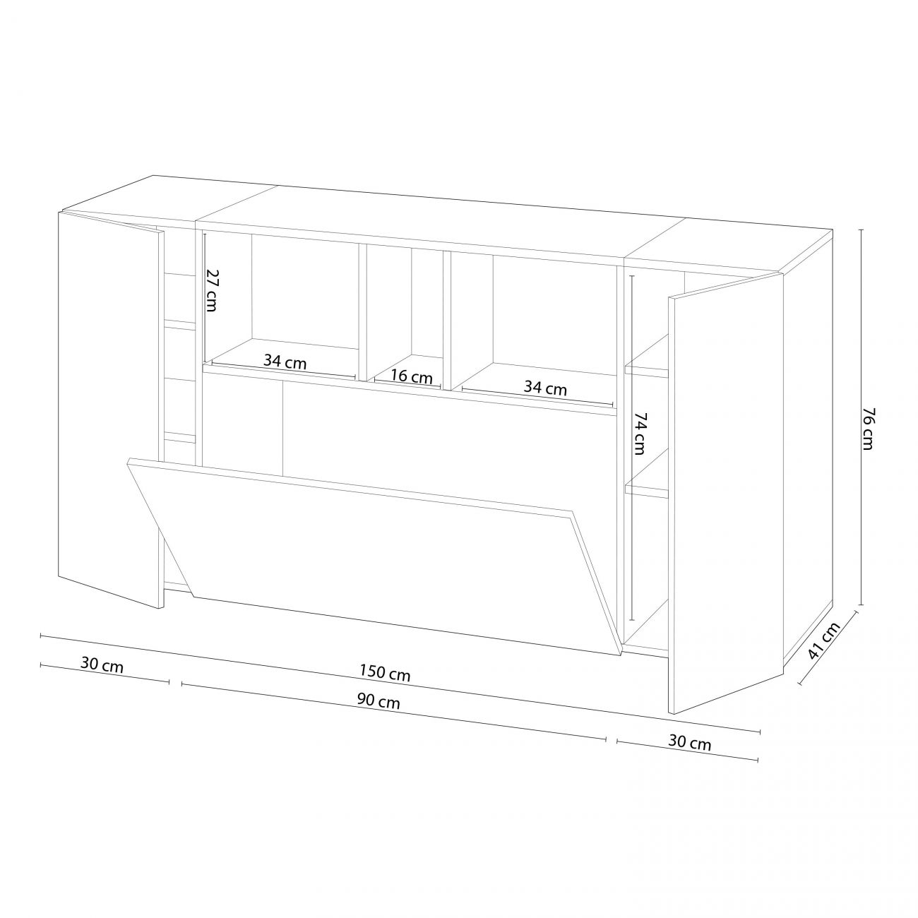 - Dimensões do móvel: 150cm x 41cm x 76 cm (largura x profundidade x altura)