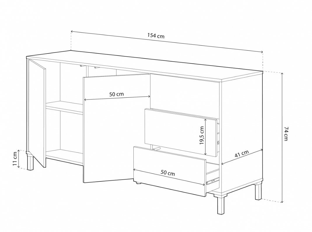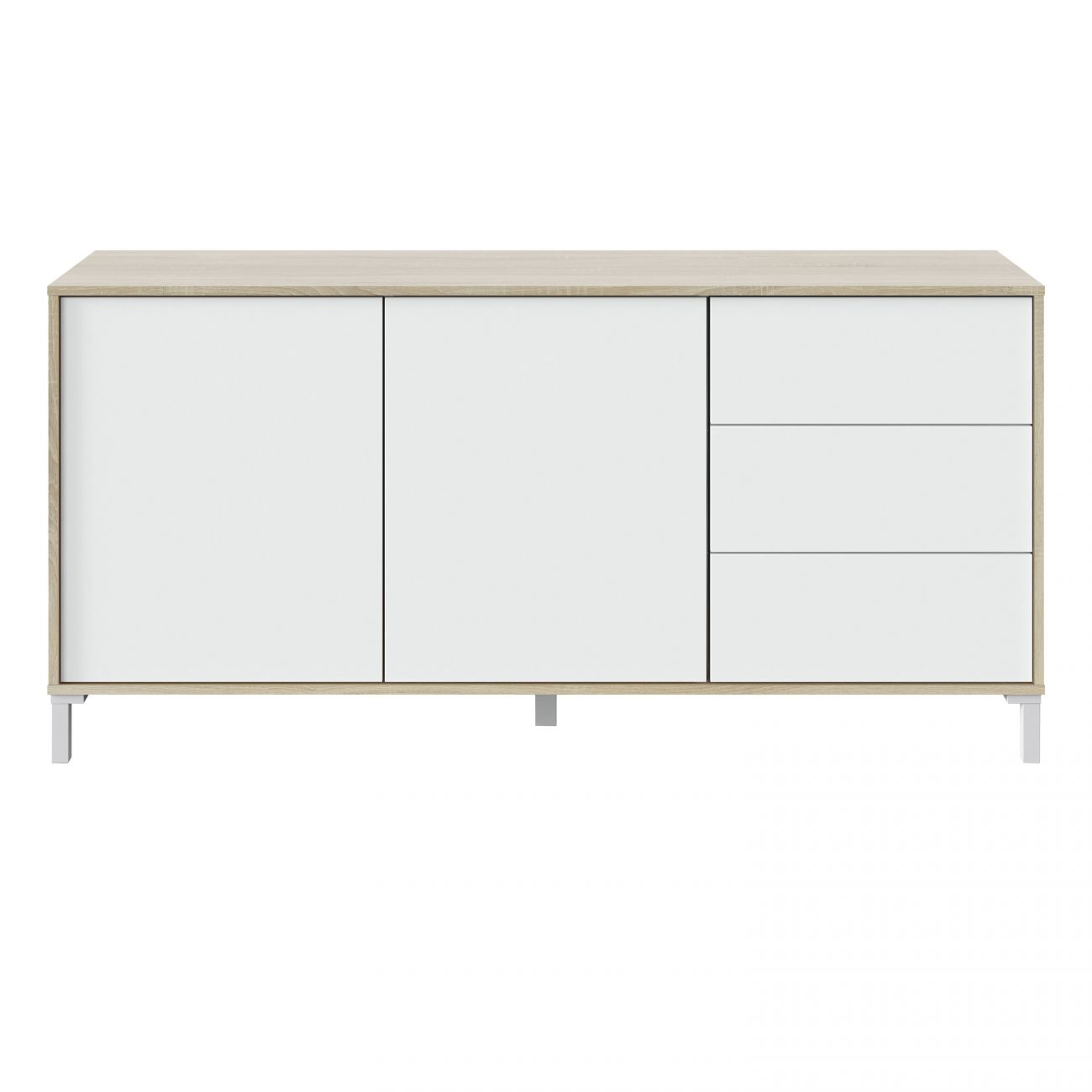 - É um aparador espaçoso de estilo nórdico com um toque industrial e uma grande capacidade de arrumação. Tem 2 módulos de arrumação: um módulo duplo tipo roupeiro, fechado com 2 portas com dobradiças metálicas e sistema de abertura por pressão, e um módulo lateral com 3 gavetas.