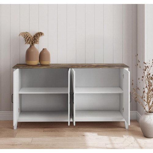 Este aparador rústico de 140 cm combina design tradicional com funcionalidade moderna, ideal para complementar salas de estar, salas de jantar ou corredores com um toque acolhedor e convidativo. Seu acabamento em melamina com efeito carvalho envelhecido e portas brancas estilo celeiro com puxadores de metal preto adicionam personalidade e estilo a qualquer ambiente.