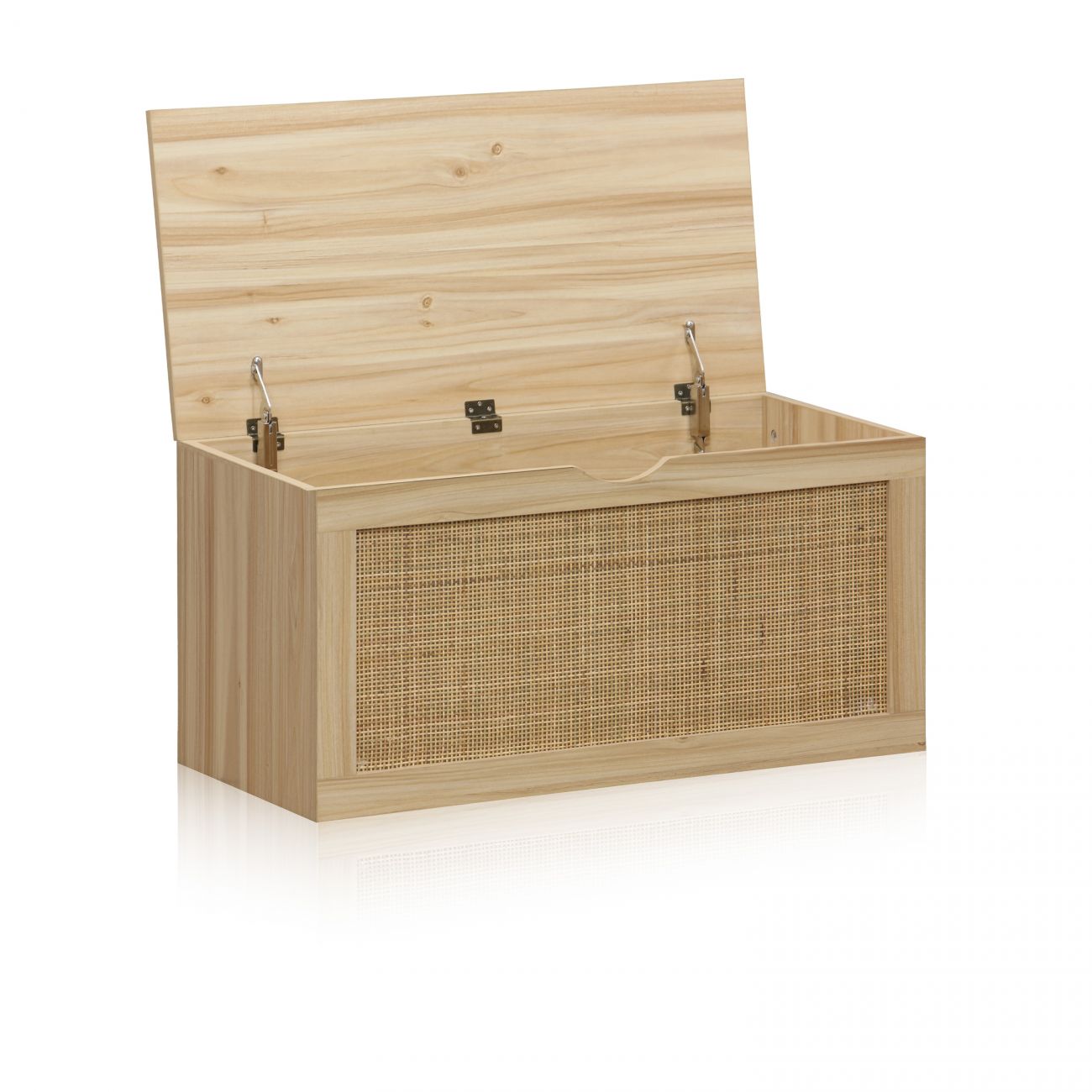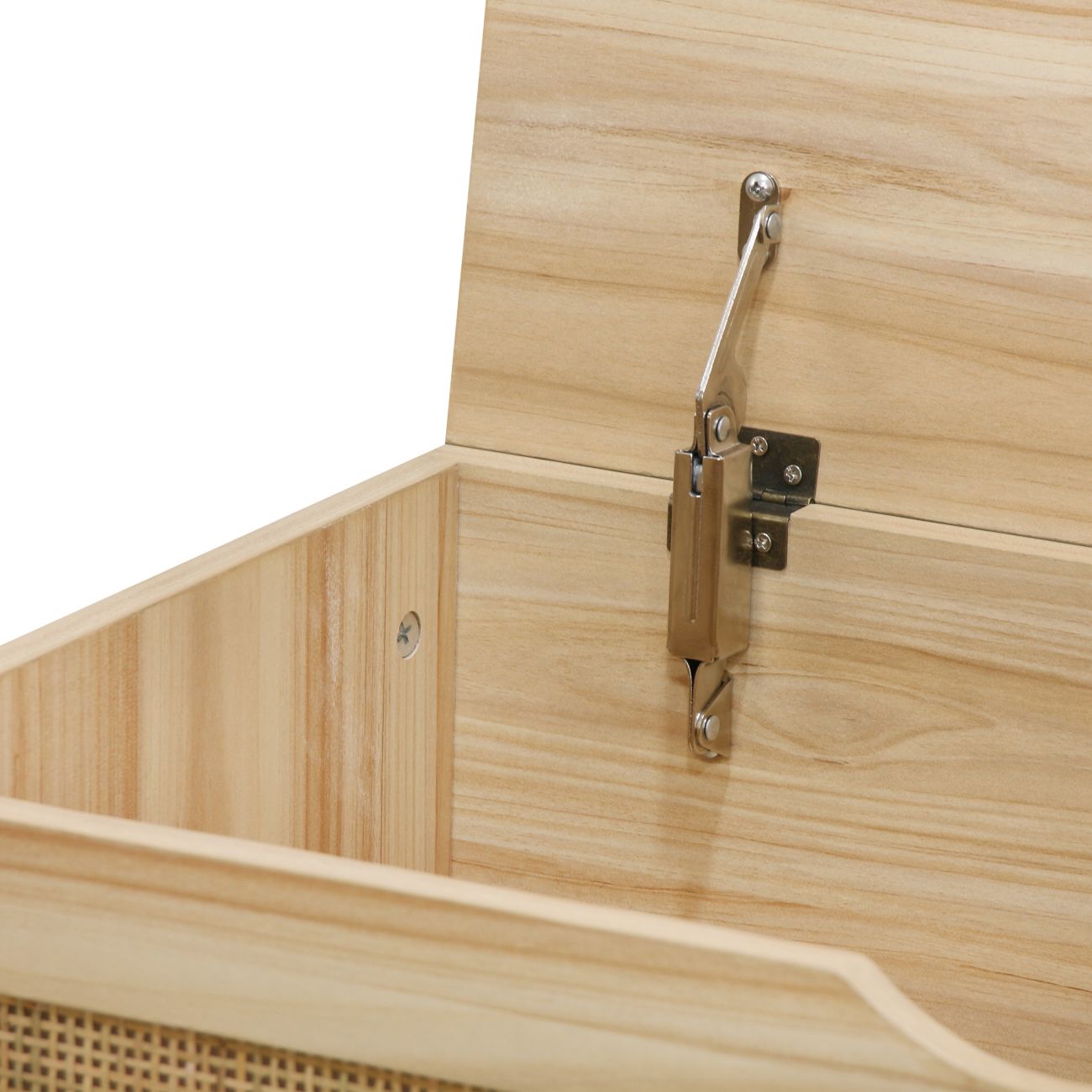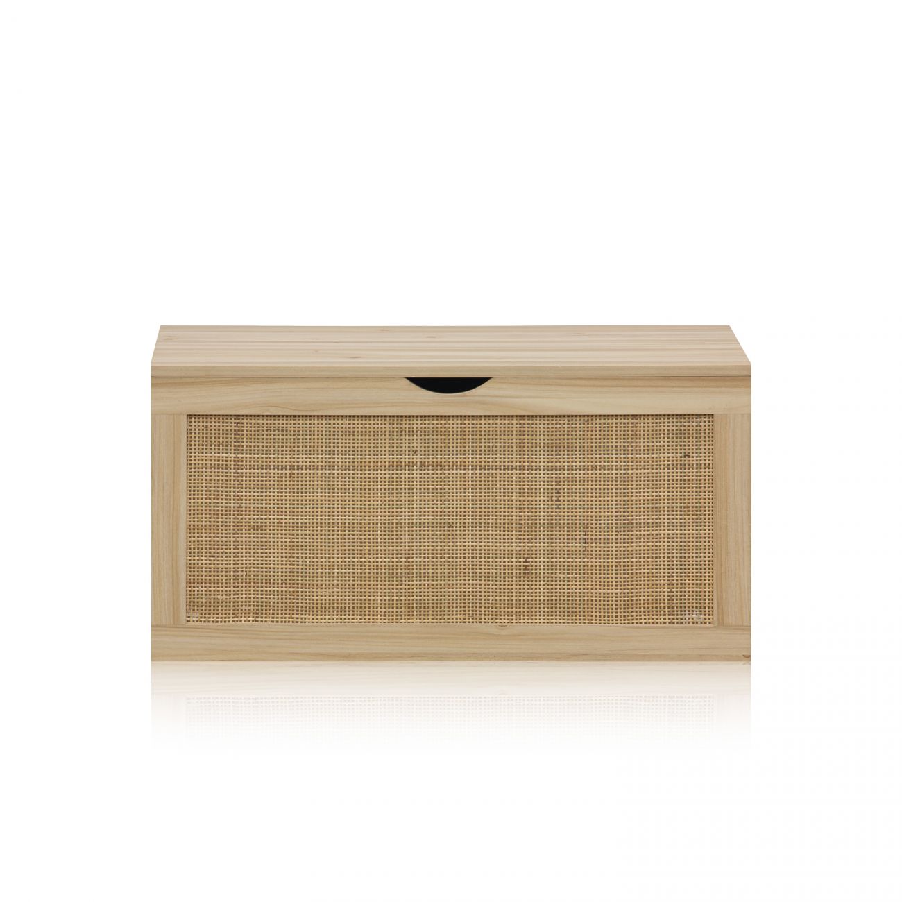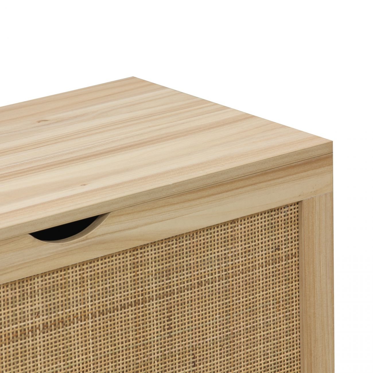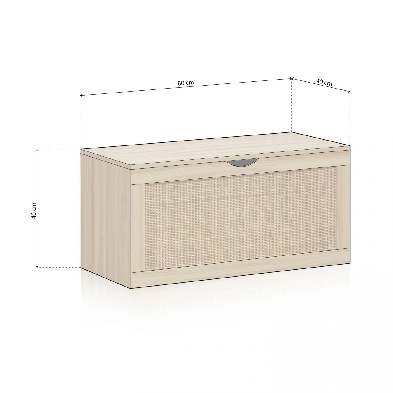 - Este elegante banco de arrumação é feito de papel laminado sobre melamina, enquanto a parte da frente é em rotim, um acabamento natural que lhe confere um charme rústico acolhedor.