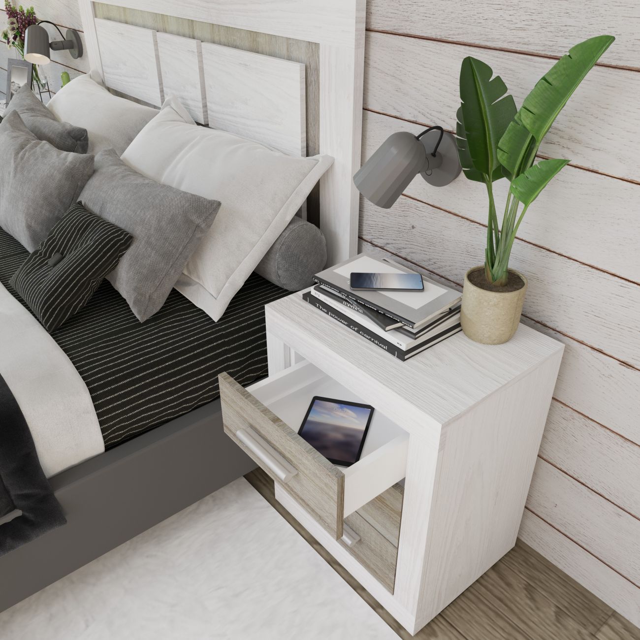 O quarto Kyra é um pack perfeito para quem procura um estilo nórdico e elegante para o seu quarto. Este pack é composto por uma cabeceira com pés e duas mesas de cabeceira, quatro modelos à escolha, em cambraia e grafite, cambraia e branco, pinho andersen e cinzento ou tofe e estampado têxtil sem textura