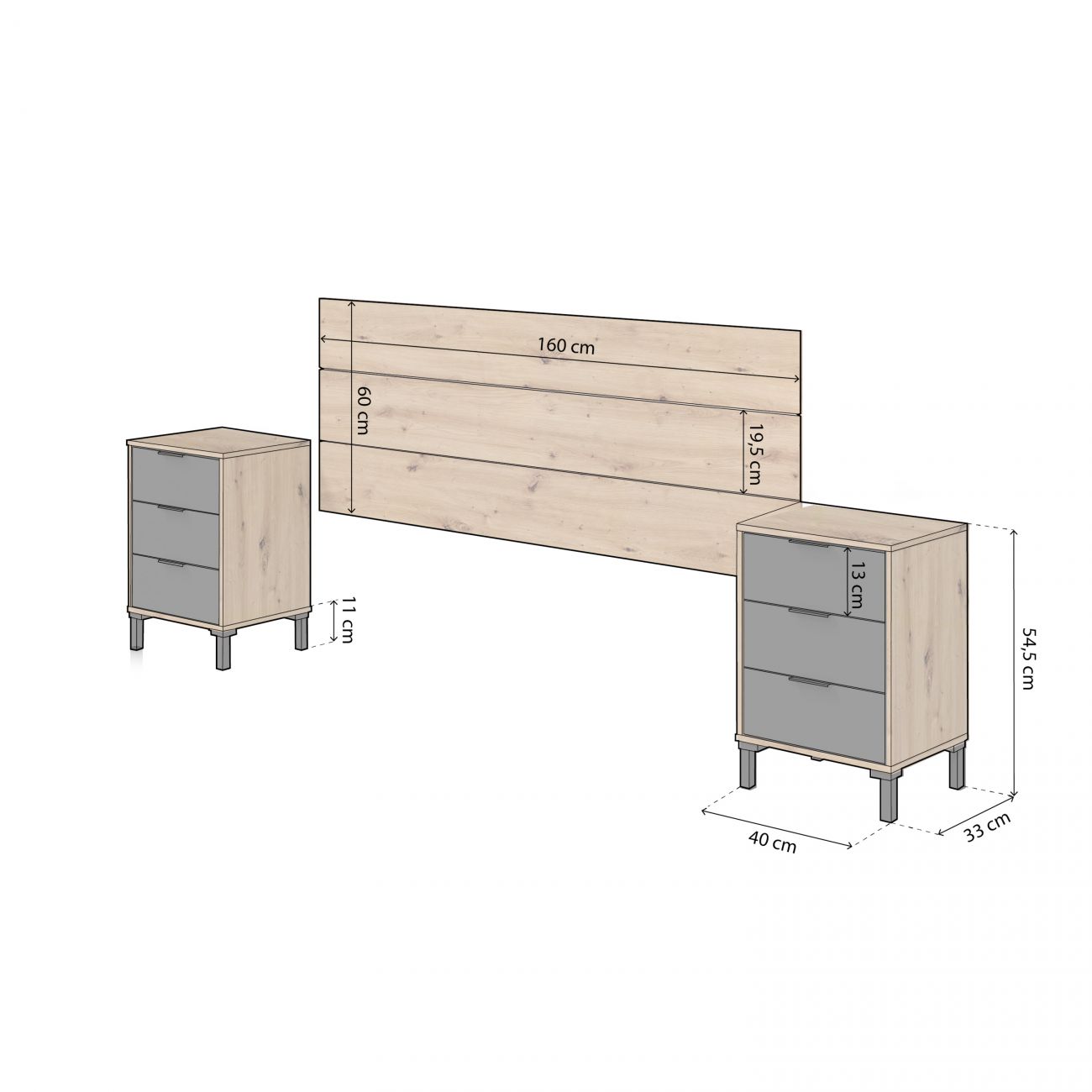 - Medidas das mesas de cabeceira: 40 cm (comprimento) x 33 cm (profundidade) x 54,5 cm (altura)