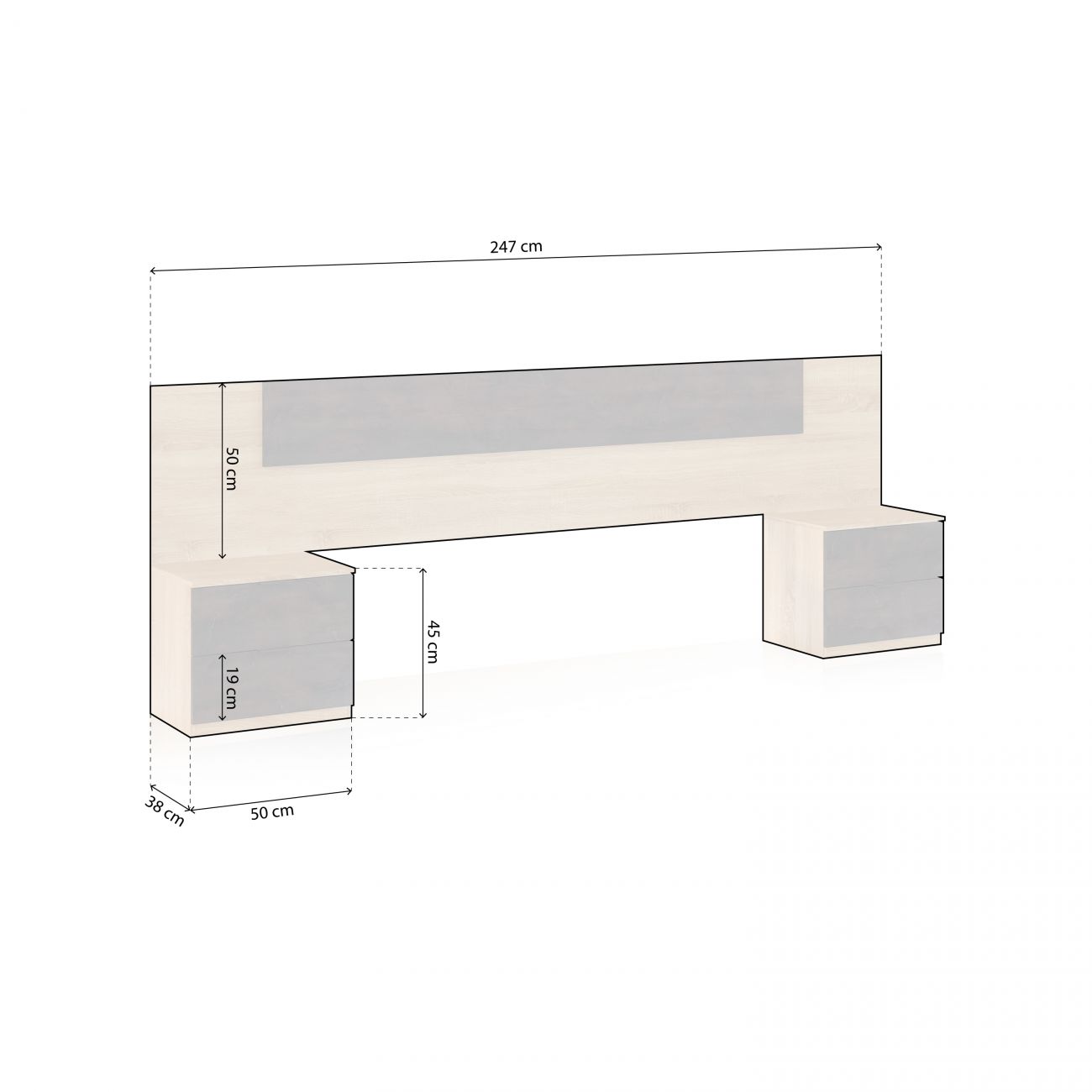 - Medidas da cabeceira: 247cm (largura) x 3cm (profundidade) x 50,5cm (altura)