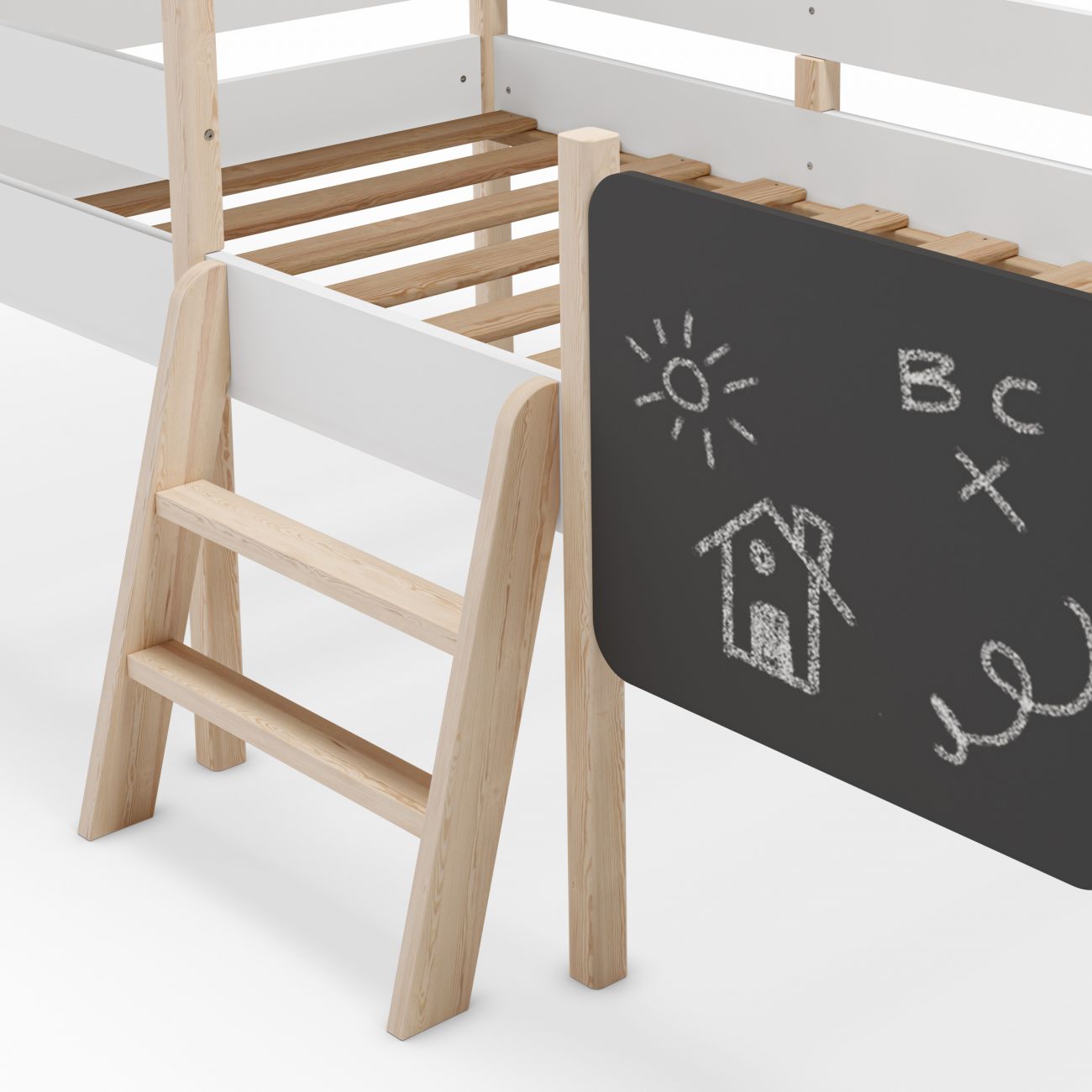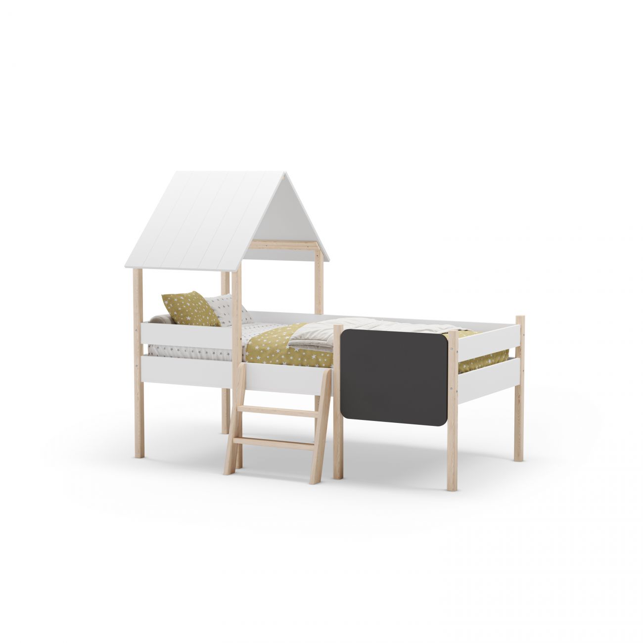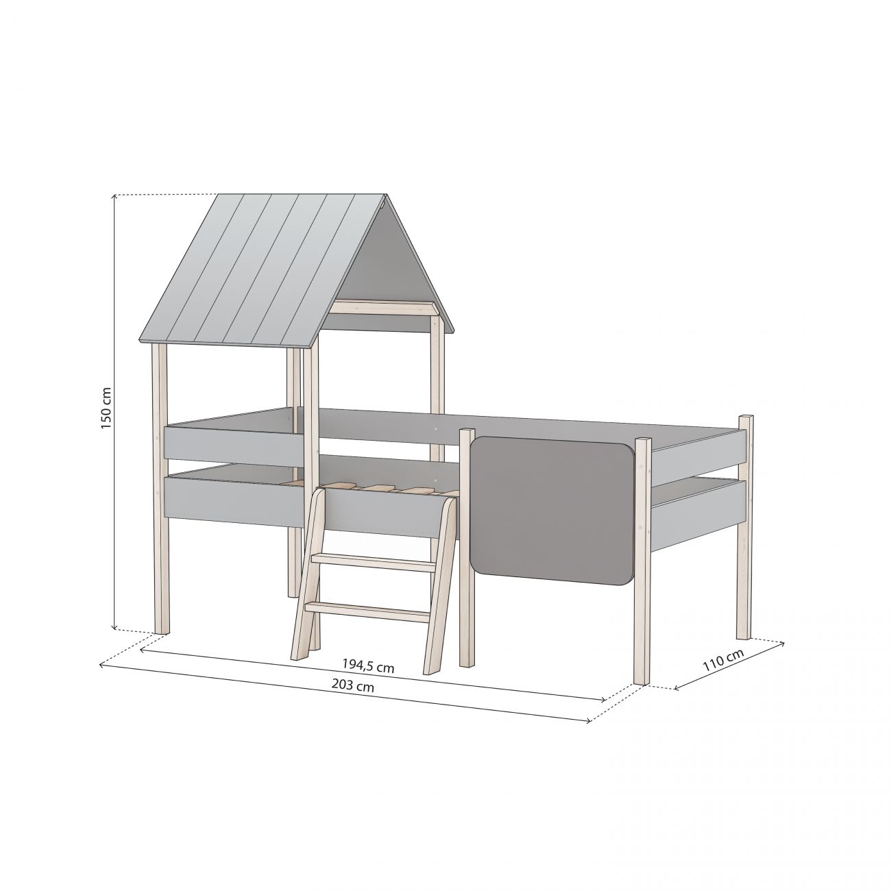 - O seu design inspirado numa cabana cria um canto acolhedoronde dormir se torna uma aventura diária. A estrutura inclui um telhado de duas águas e uma ardósia integrada, perfeita para dar asas à sua criatividade antes de dormir.