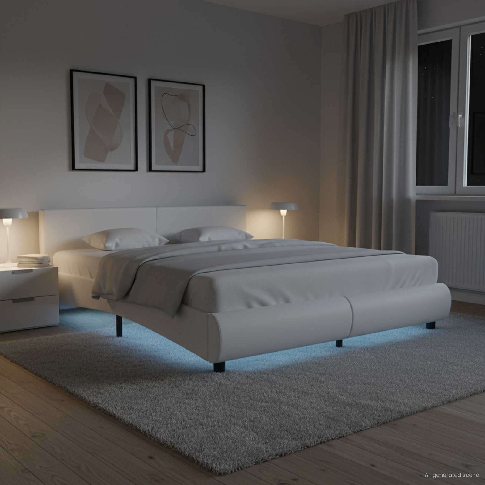 Distinguida por um design simples e intemporal, a estrutura de cama acrescenta um toque de charme elegante à decoração do seu quarto. A estrutura de aço revestido a pó e as ripas de madeira são um complemento extra à resistência e durabilidade da cama. Estofada em couro artificial durável e fácil de limpar, a cama exala um aspeto convidativo. Pode ajustar convenientemente a potência, o brilho e as diferentes cores intermitentes da faixa de luzes LED com o controlo remoto de 24 teclas, totalmente funcional e incluído, para criar um deslumbrante espetáculo de luz.