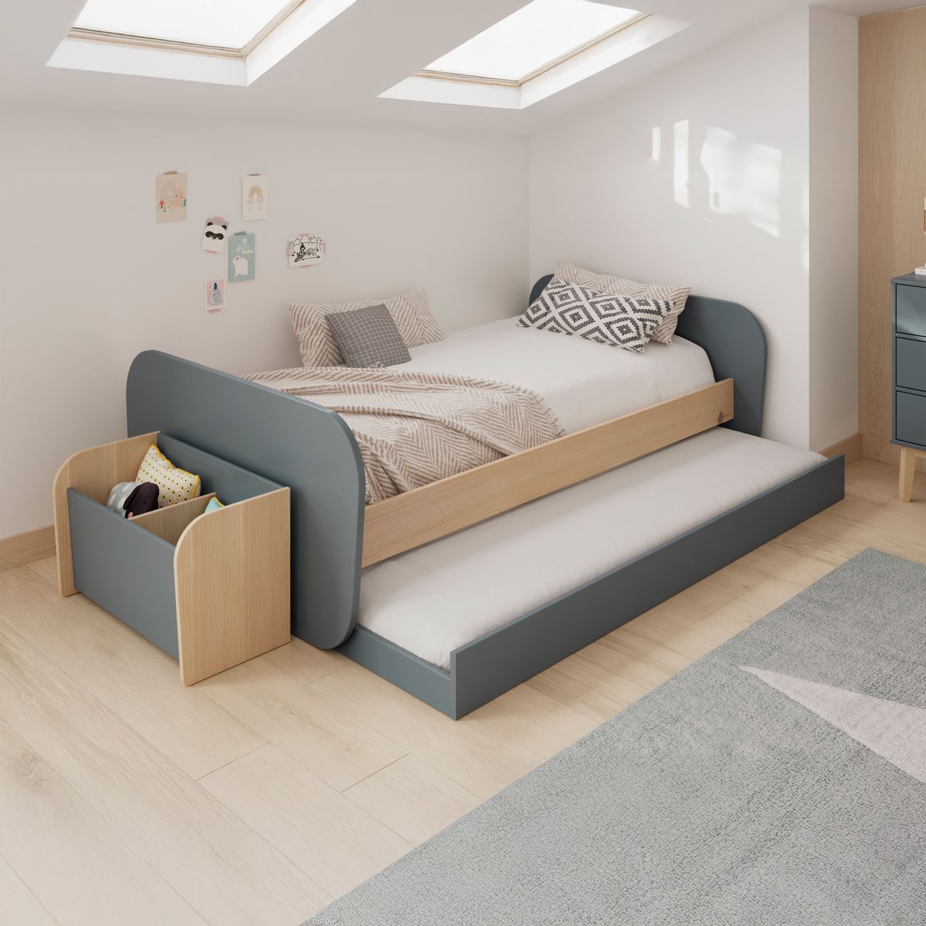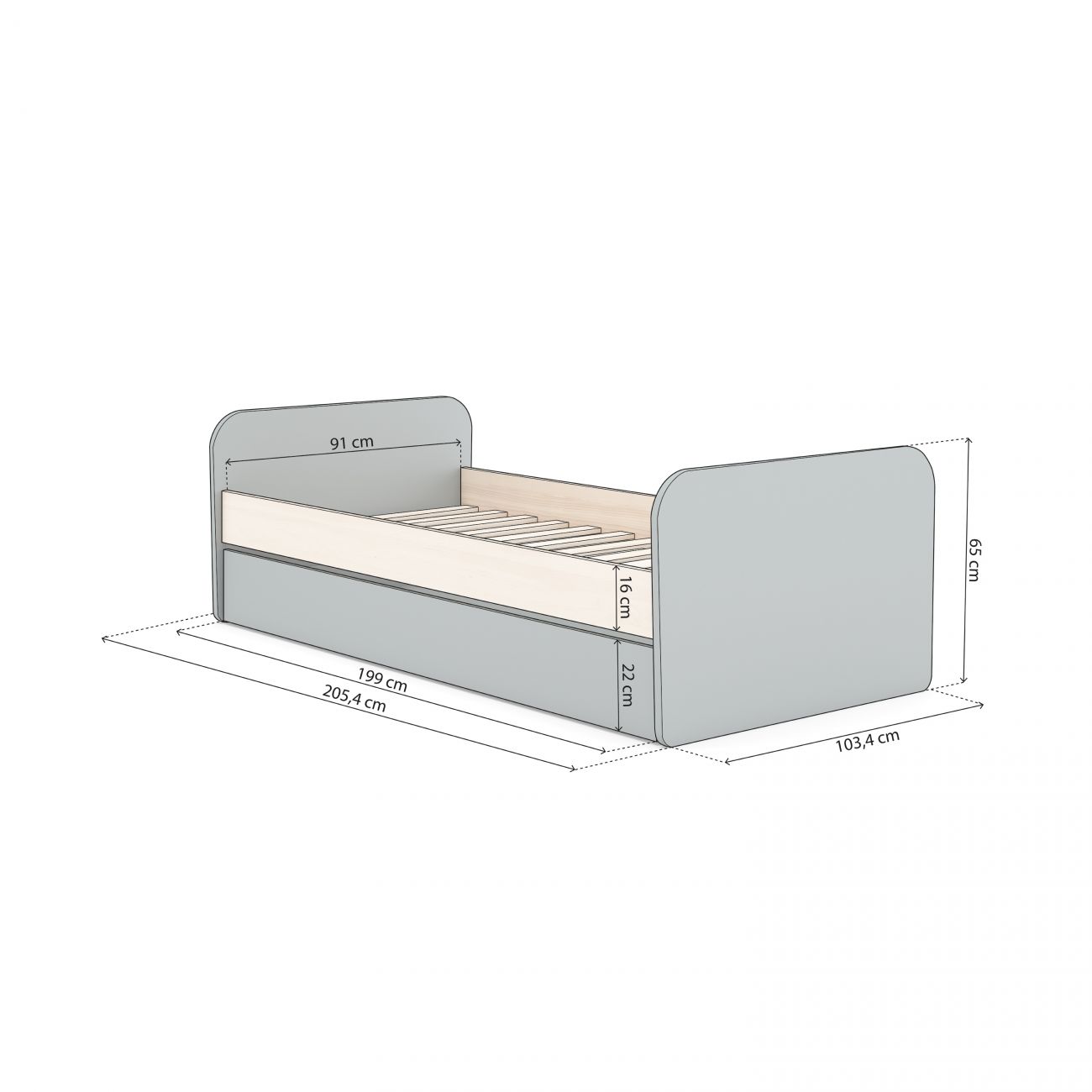 - Graças ao seu design minimalista e à sua versatilidade, esta cama com gavetão não só decora o quarto, como o transforma num espaço acolhedor e prático. Foi concebida para colchões de 90x190 cm, garantindo a compatibilidade com as medidas padrão e facilitando a sua integração na maioria dos quartos de crianças e jovens.