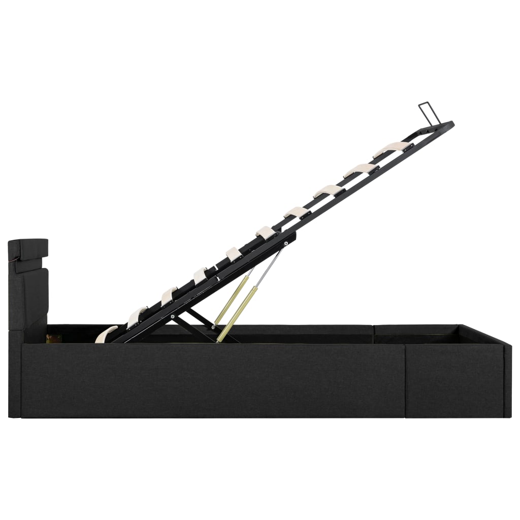 Adicione instantaneamente um toque moderno impressionante ao seu quarto com a nossa estrutura de cama hidráulica em tecido! Esta cama de solteiro é caracterizada por um design simples e elegante, além de uma construção sólida, pois é fabricada em MDF forte e robusto.estrutura de aço revestida a pó e as ripas de madeira compensada aumentam a robustez e a durabilidade da cama. Estofada em tecido durável, esta cama com arrumação é convidativa e fácil de manter. Este produto é fácil de montar.Poderá ainda ajustar convenientemente a potência, o brilho e as diferentes cores intermitentes da faixa de luzes LED com o controlo remoto de 24 teclas totalmente funcional e incluído, para criar um fantástico espetáculo de iluminação.