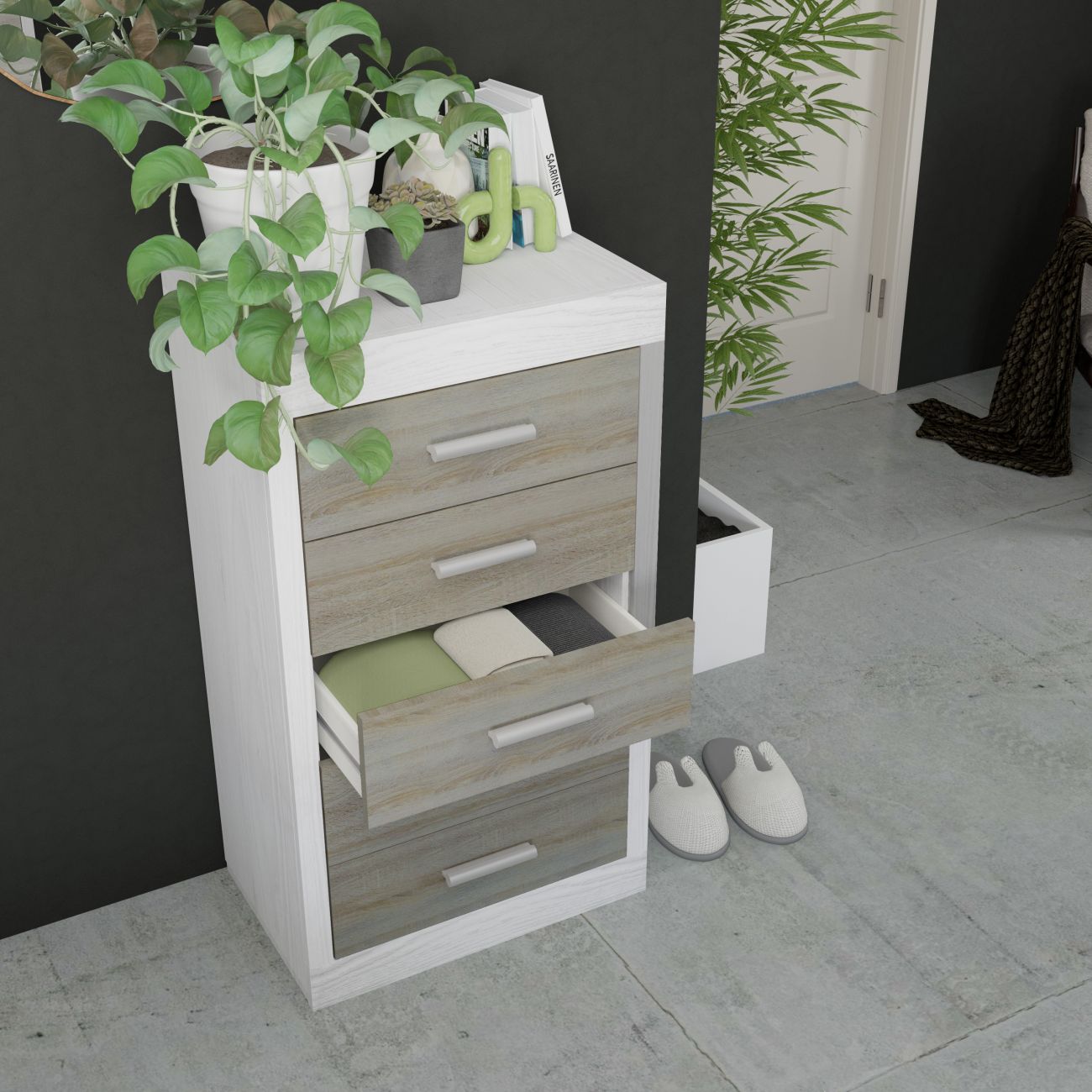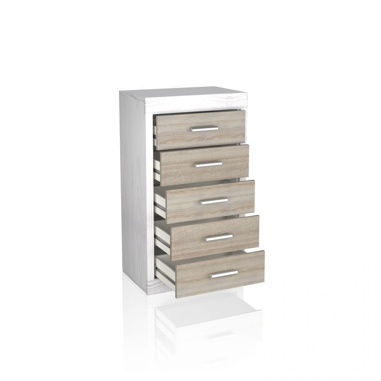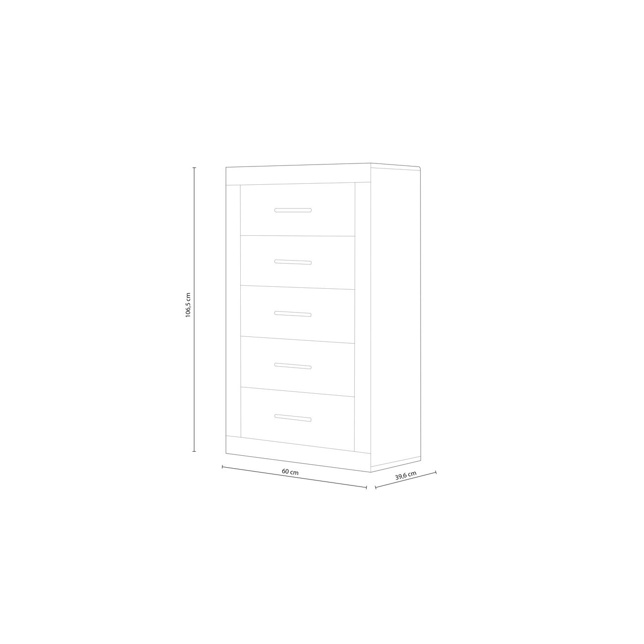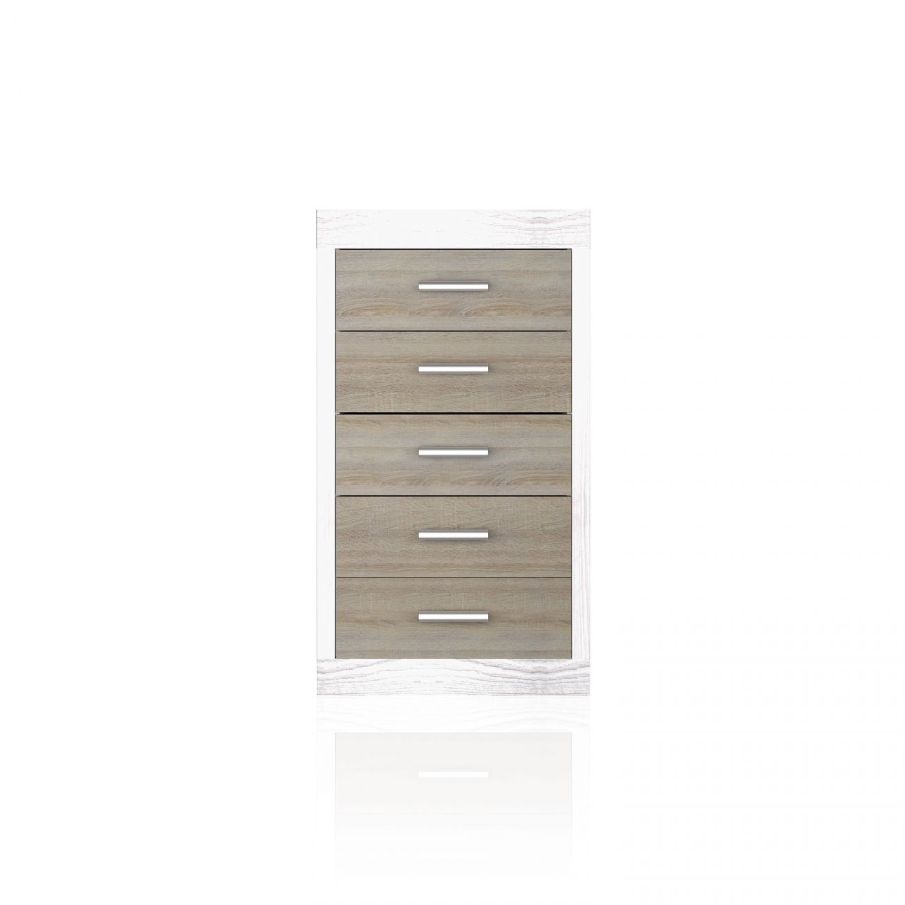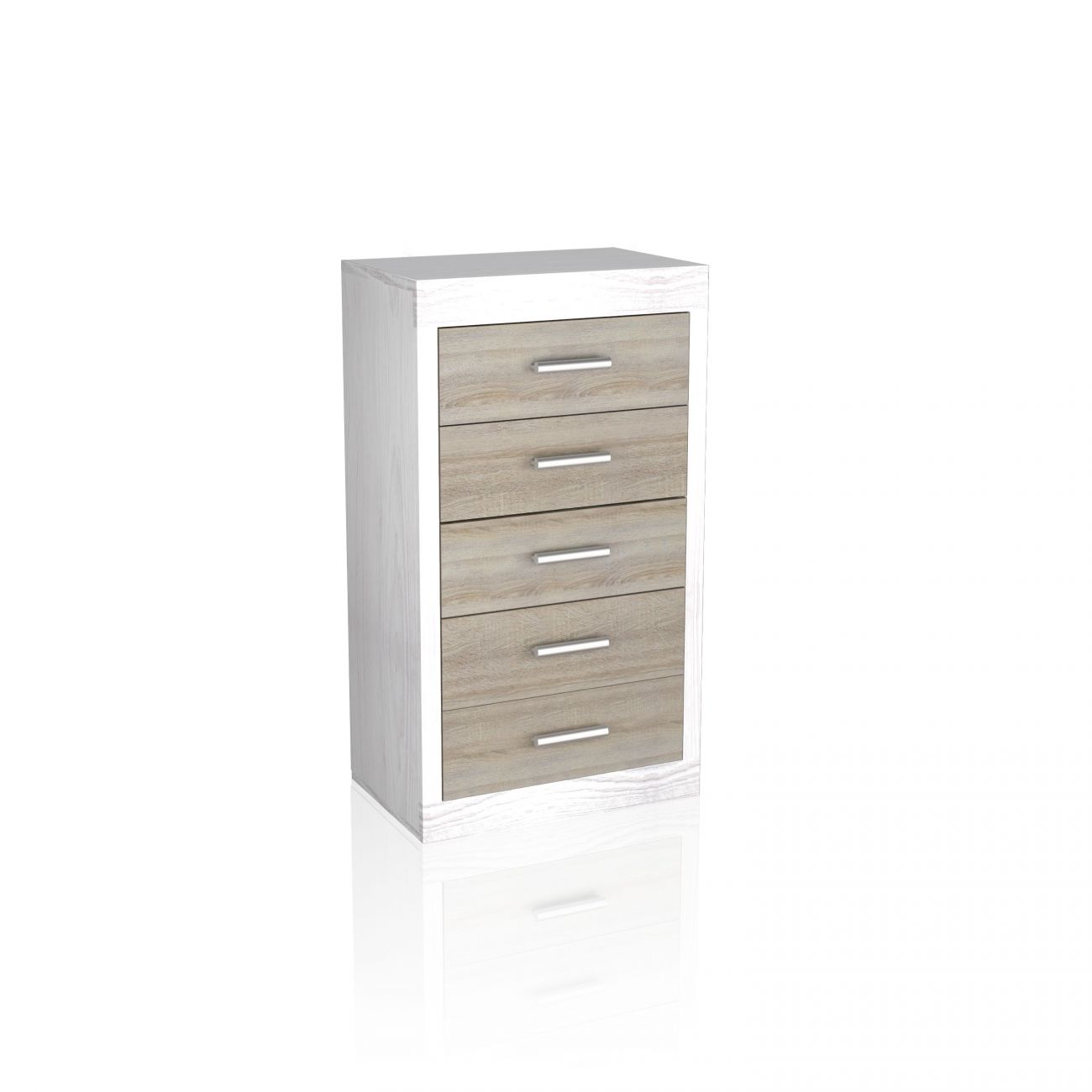 A cómoda Liz é uma cómoda espaçosa de 5 gavetas com frentes contrastantes e um estilo moderno que fica muito bem nos quartos actuais