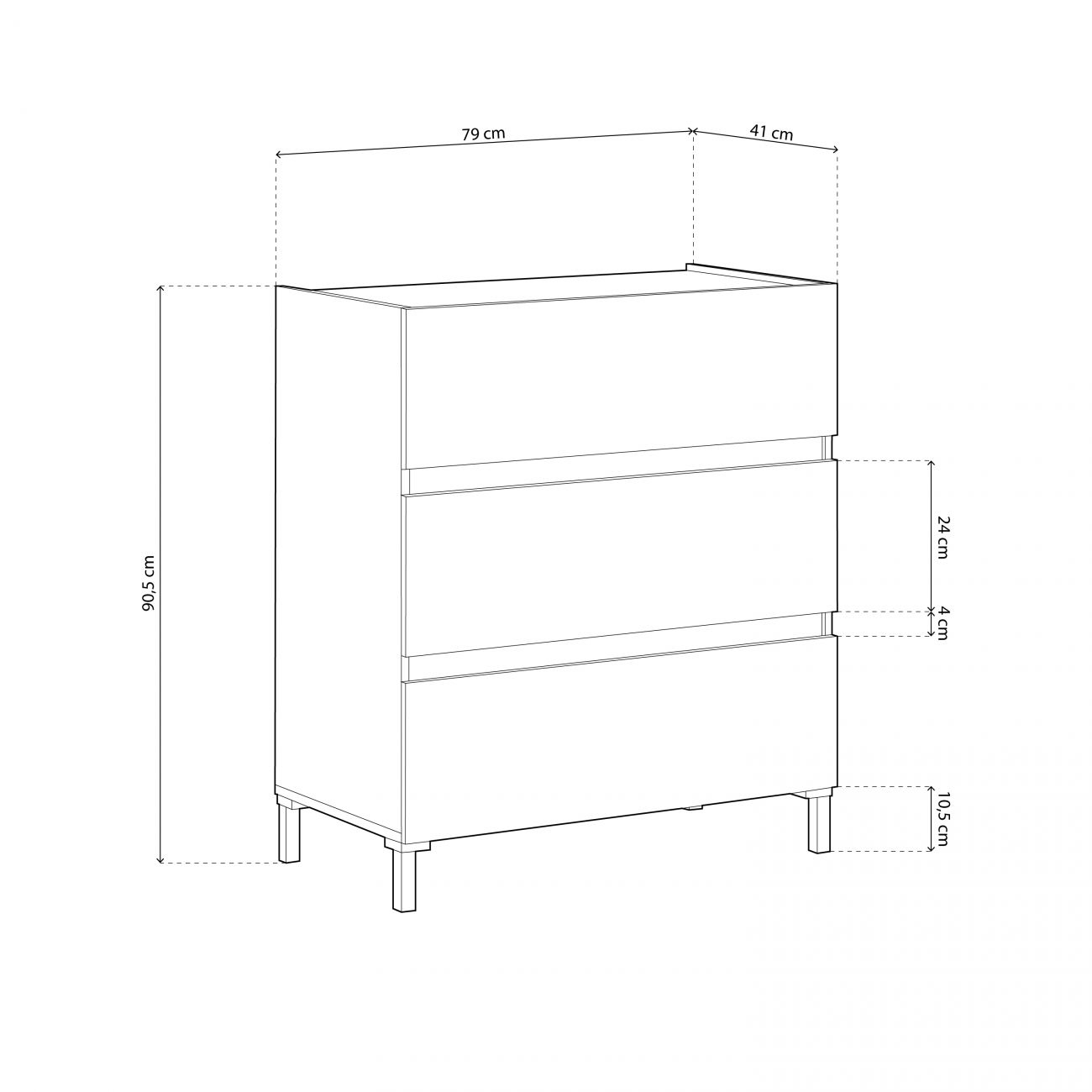 - Medidas da cómoda: 79 cm (comprimento) x 90,5 cm (altura) x 41 cm (profundidade)