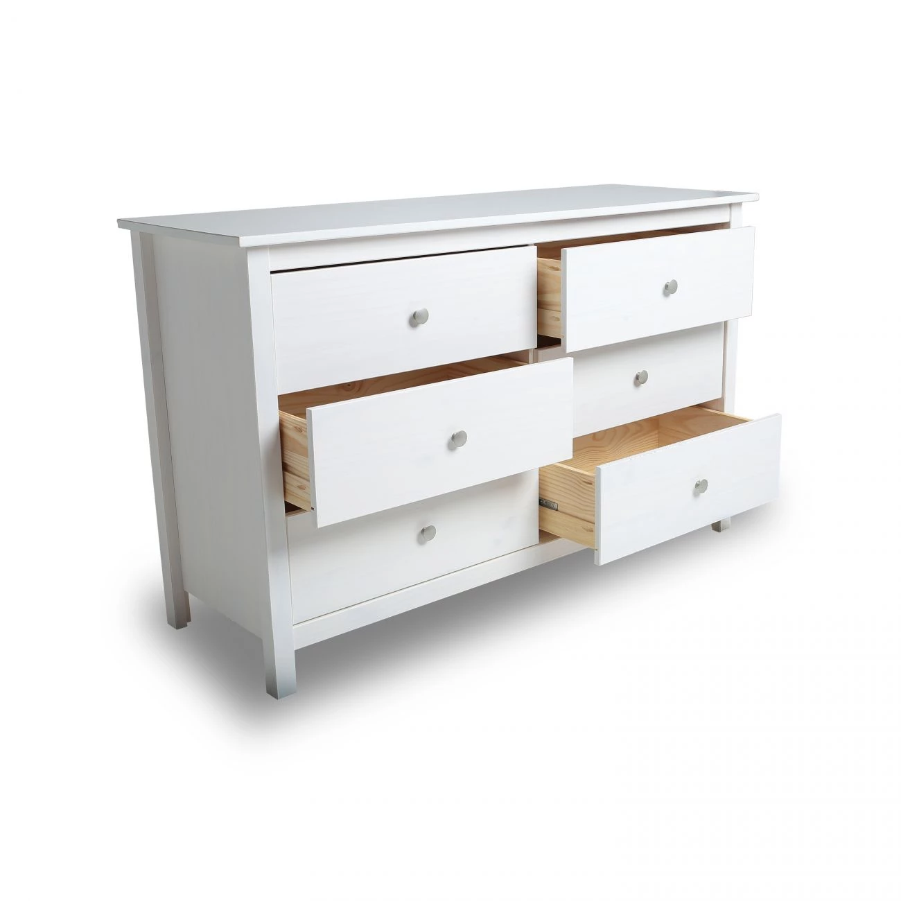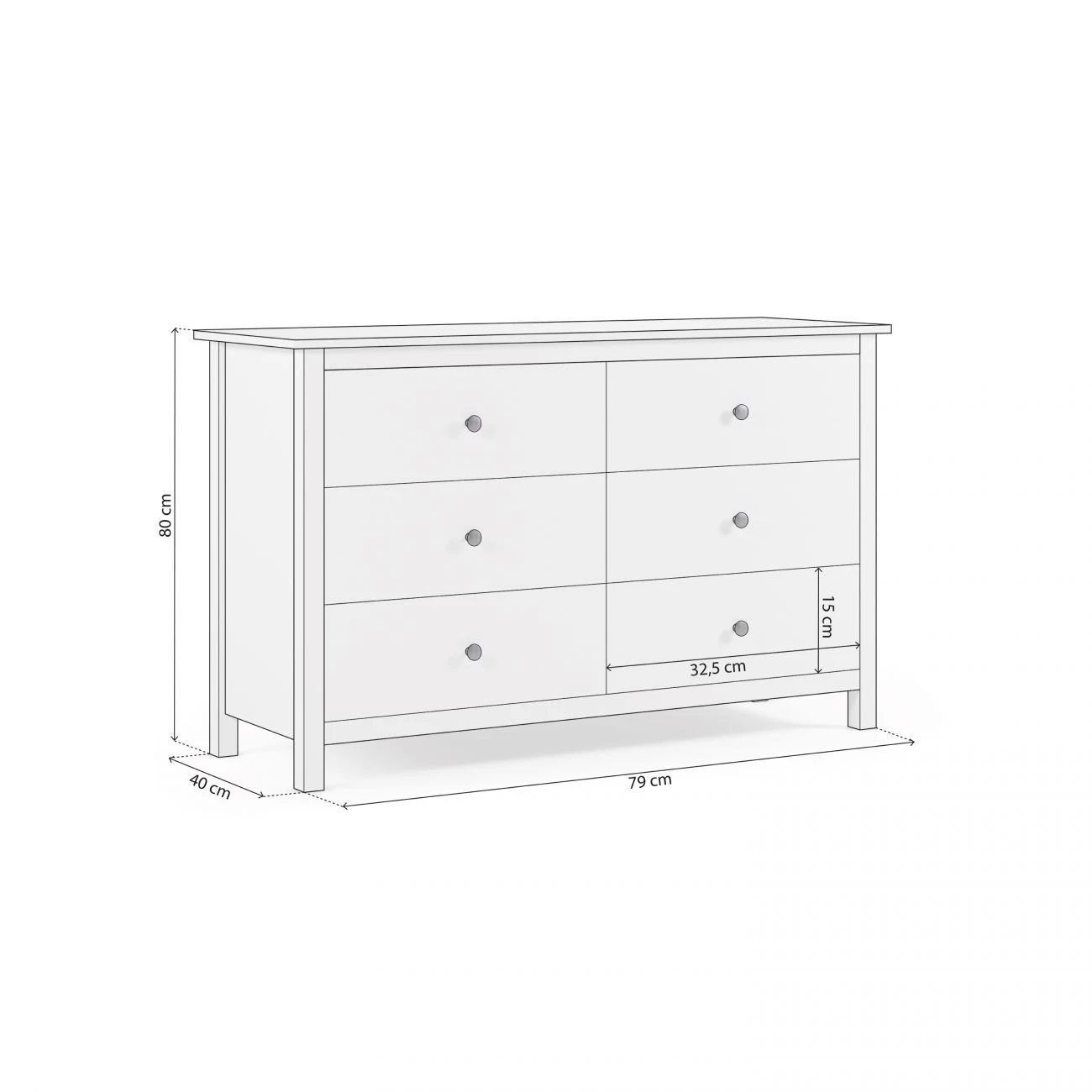 - Fabricada com materiais de alta qualidade, esta cómoda destaca-se pela sua resistência e durabilidade. As gavetas têm corrediças metálicas que permitem uma abertura suave e uma utilização confortável no dia a dia. O seu design prático inclui seis gavetas espaçosas, perfeitas para manter em ordem a roupa, os acessórios ou qualquer tipo de têxtil.