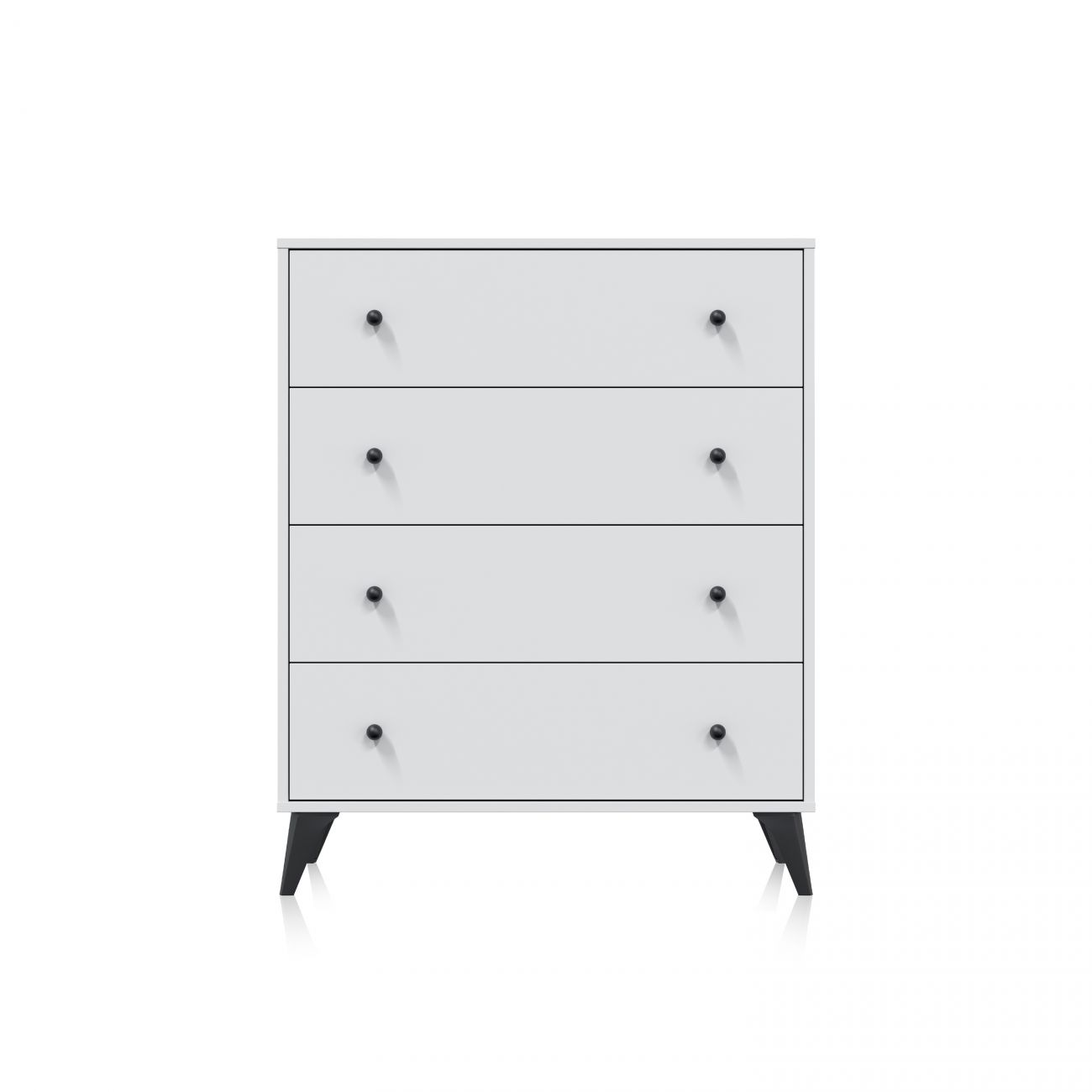 - É composta por 4 pés e 4 gavetas não extraíveis com corrediças metálicas e acabamento interior branco com puxadores esféricos em ABS.
