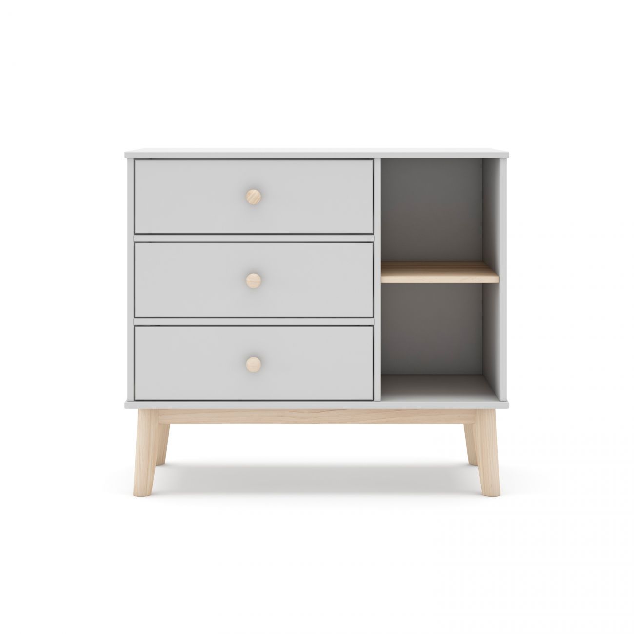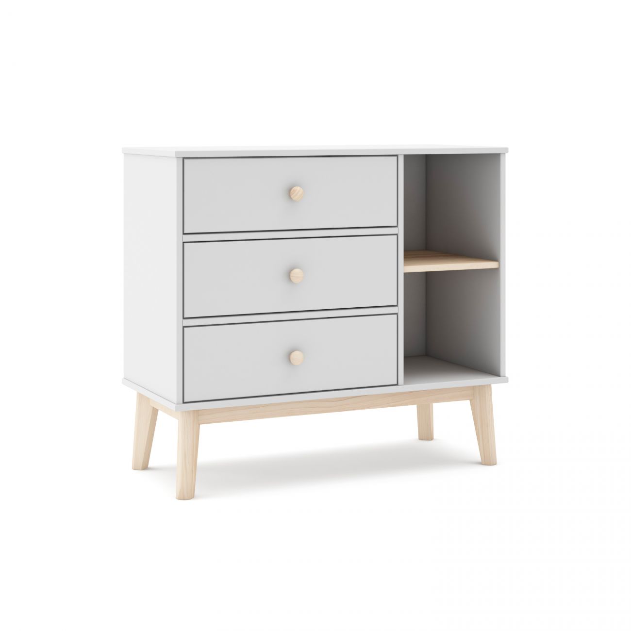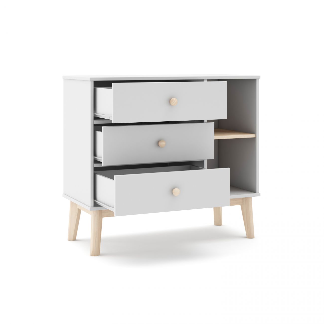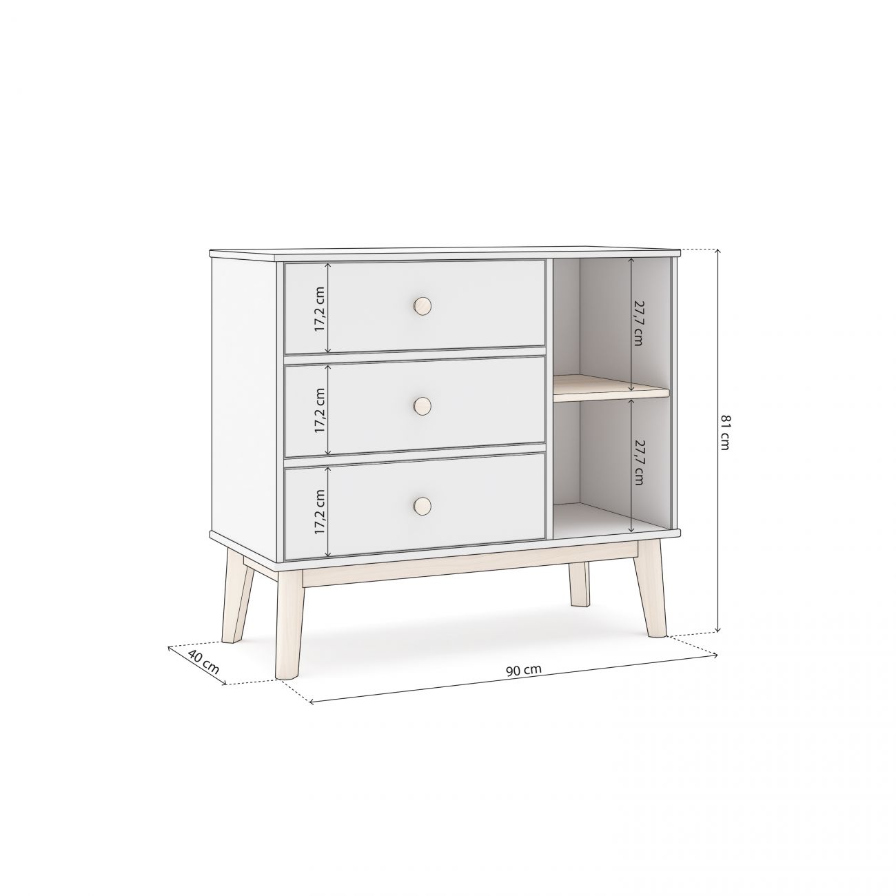 - O móvel está estruturado em três grandes gavetas verticais que oferecem uma solução prática para guardar roupa, acessórios ou material escolar. Estas gavetas, equipadas com corrediças metálicas, permitem uma abertura suave e cómoda, mesmo no uso diário. Na parte lateral, incorpora dois compartimentos abertos perfeitos para manter à vista livros, objectos decorativos ou cestos organizadores.