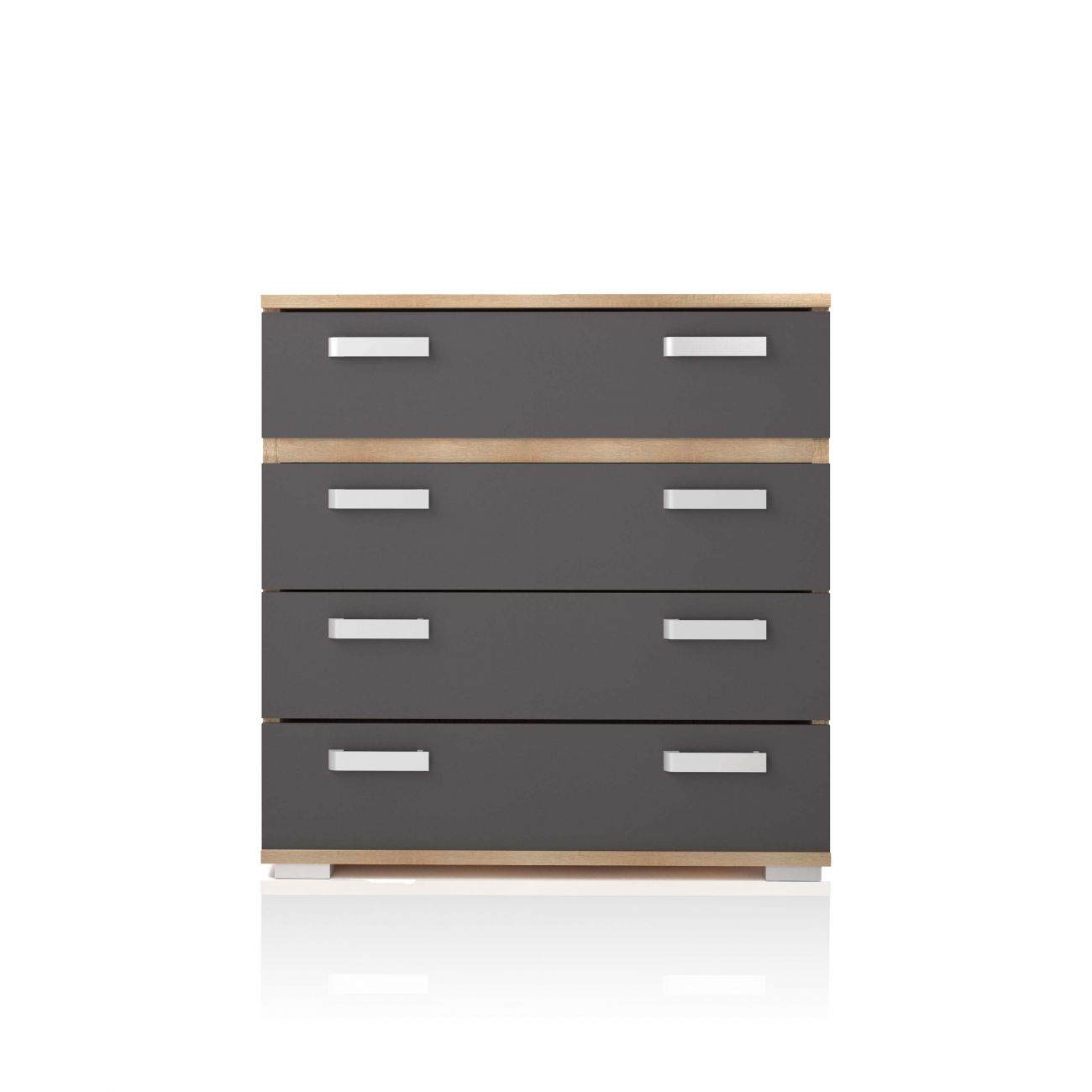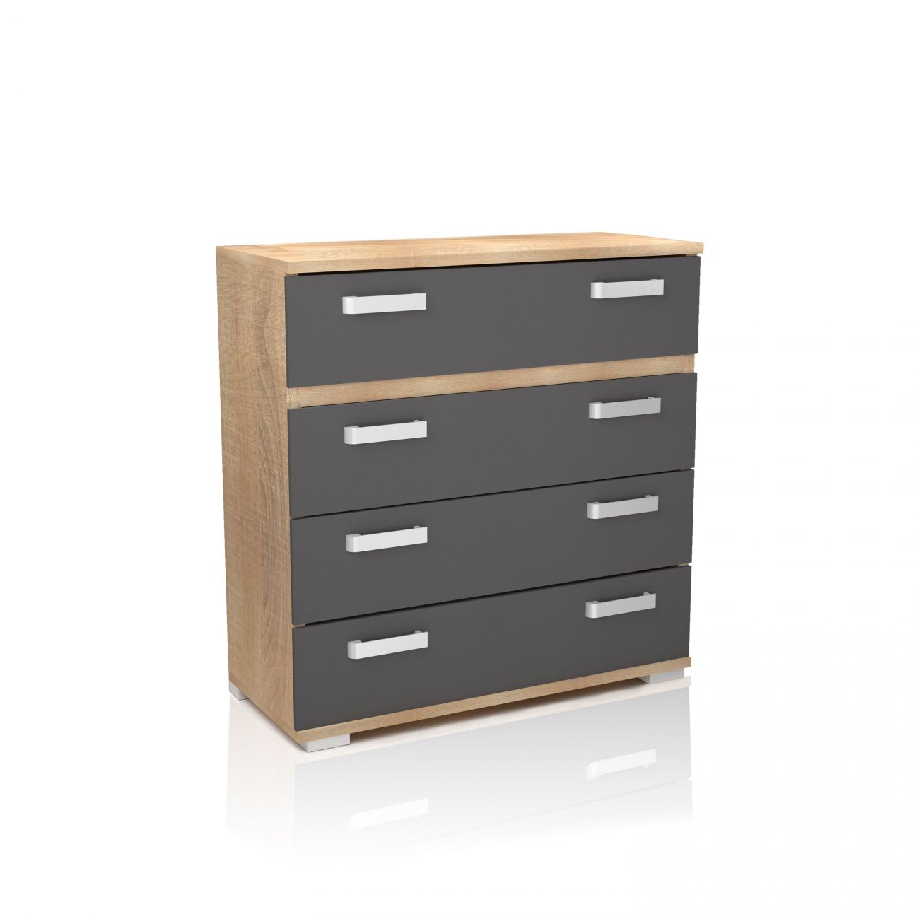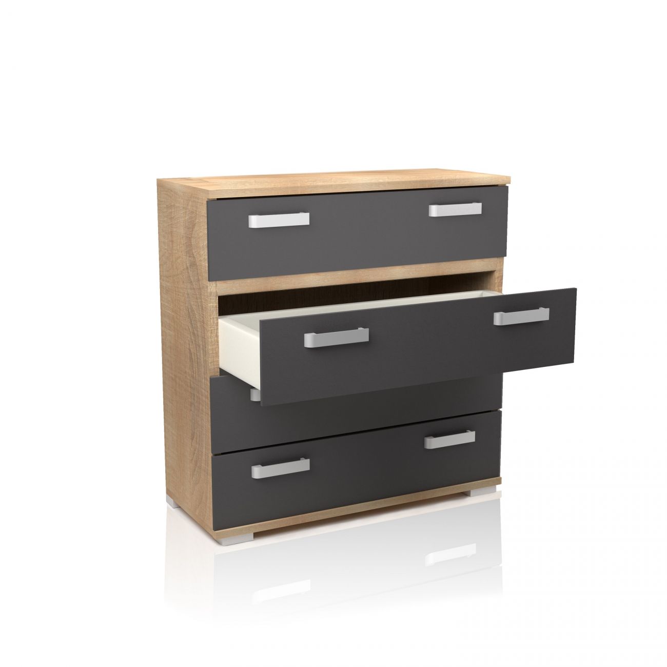 - É composta por 4 gavetas, com a caraterística de a de cima estar um pouco mais separada das outras. Cada uma das gavetas tem frentes contrastantes e elegantes puxadores lacados a prata.Inclui pequenas pernas de 1,5 cm de altura para aproveitar ao máximo o espaço que ocupa, será colado para que não se vejam espaços perdidos ou vazios.