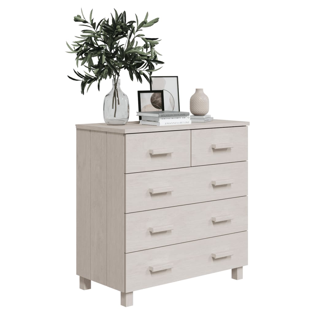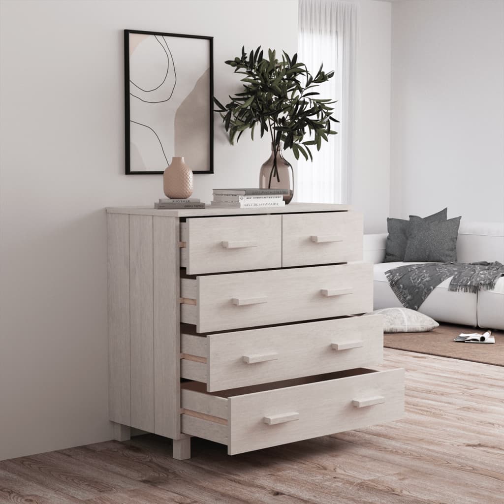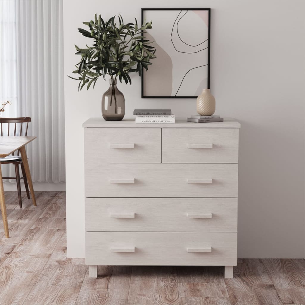 Este aparador em madeira é um complemento decorativo e prático para a sua decoração.Este armário de gavetas é feito em madeira de pinho maciça, tornando-o estável e robusto. O aparador também possui 5 gavetas que deslizam suavemente, proporcionando um amplo espaço de arrumação para manter os seus vários artigos essenciais diários bem organizados e fáceis de alcançar. O tampo resistente é perfeito para expor objetos decorativos, molduras e vasos com plantas.