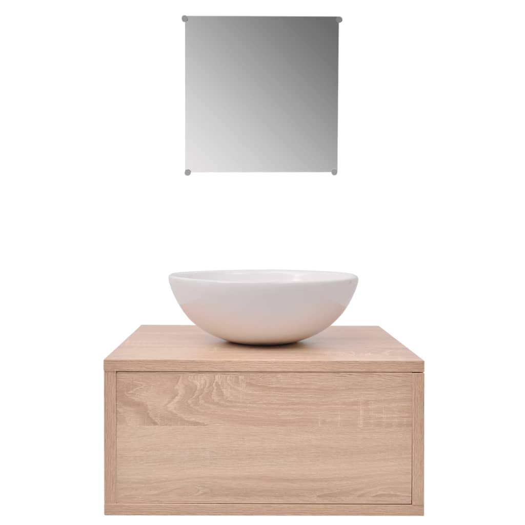 Este conjunto completo, composto por 1 gabinete de bacia montado na parede, 1 espelho e 1 bacia, será uma grande adição a sua casa de banho, otimizando espaço sem comprometer o estilo.O conjunto de móveis de casa de banho inclui um espelho e um gabinete de bacia.O tamanho compacto e o design minimalista torná-lo um excelente complemento para qualquer banheiro moderno. Feito de aglomerado de alta qualidade, este gabinete com espelho é muito resistente e durável.A bacia é feita de cerâmica de alta qualidade, à prova de riscos, resistente à corrosão e fácil de limpar.É adequada para ser montada acima da bancada.A entrega também inclui um escoamento de drenagem e acessórios de montagem.Nota: Por favor, tomar em conta que a torneira não está incluída na entrega; o furo para a torneira não é pré-perfurado.