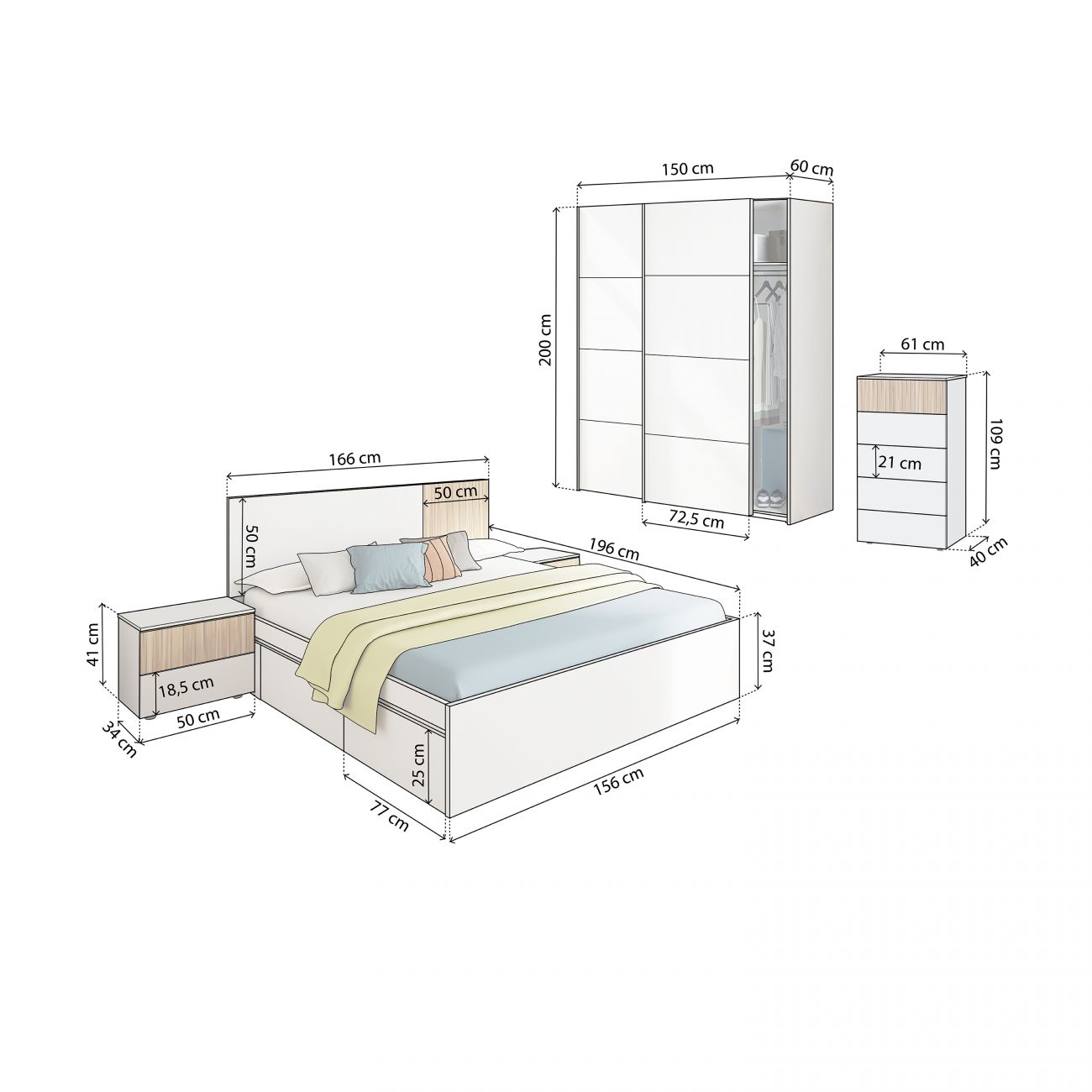 - Quarto com roupeiro, cama, cabeceira da cama, mesas de cabeceira e cómoda, tudo num único pack