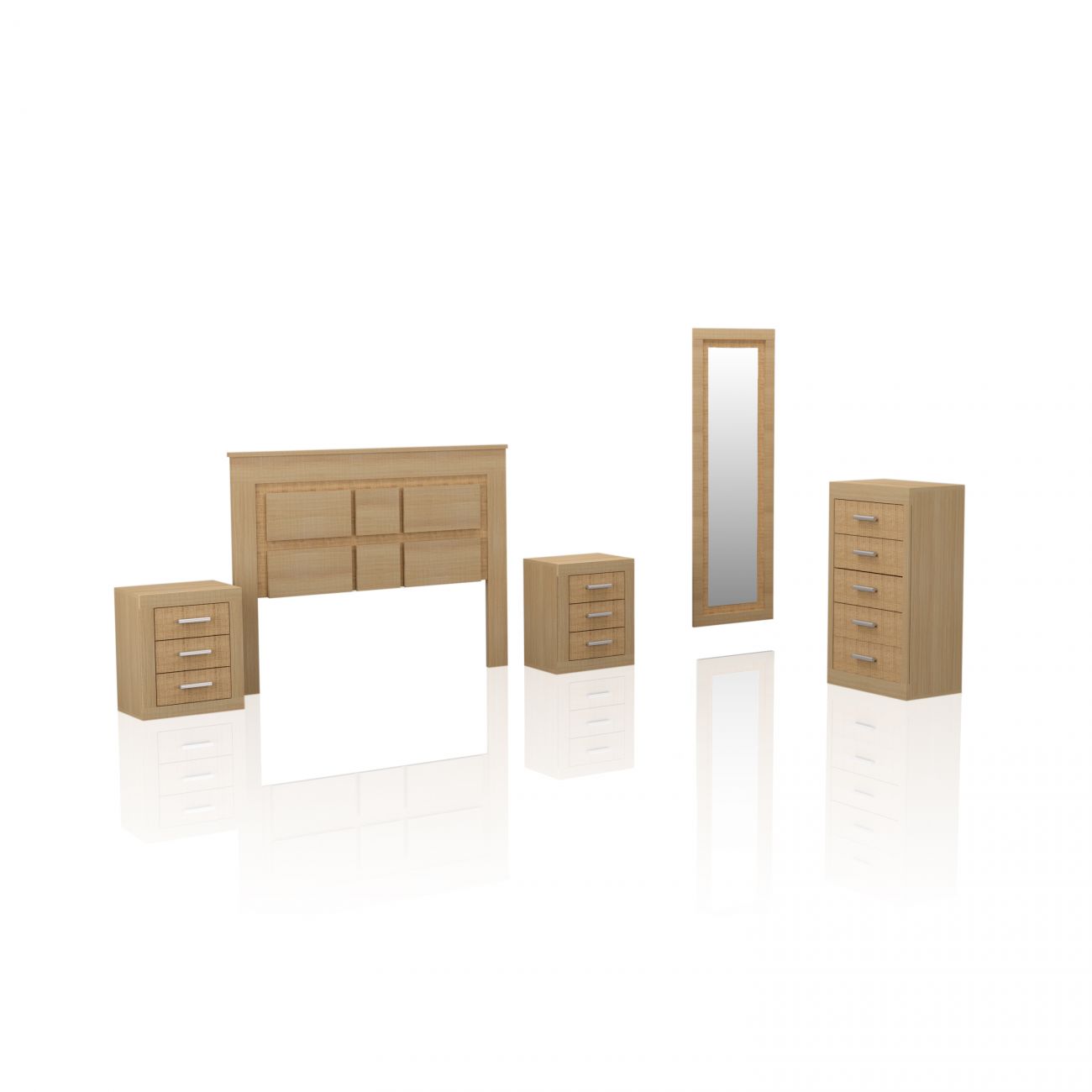 O quarto Kira 5C é um pacote de mobiliário de estilo nórdico que inclui uma cabeceira com pernas, duas mesas de cabeceira, um espelho de parede e uma cómoda com cinco gavetas.