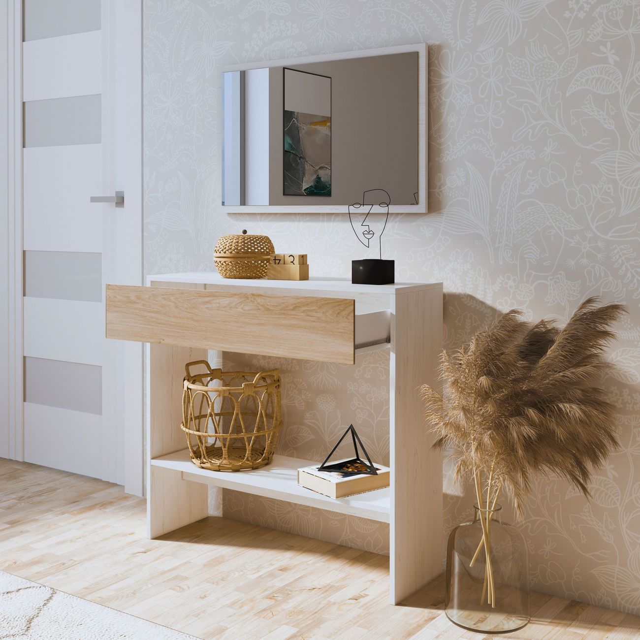 - É um hall de entrada composto por um espelho emoldurado e um pequeno armário com gaveta e prateleira inferior. Ideal para entradas ou espaços que se pretendam decorar como um hall de entrada. Será o seu fiel companheiro em espaços pequenos, pois o espelho ajudará a dar uma sensação de amplitude e o pequeno móvel permitir-lhe-á ganhar espaço de arrumação sem ser demasiado volumoso.