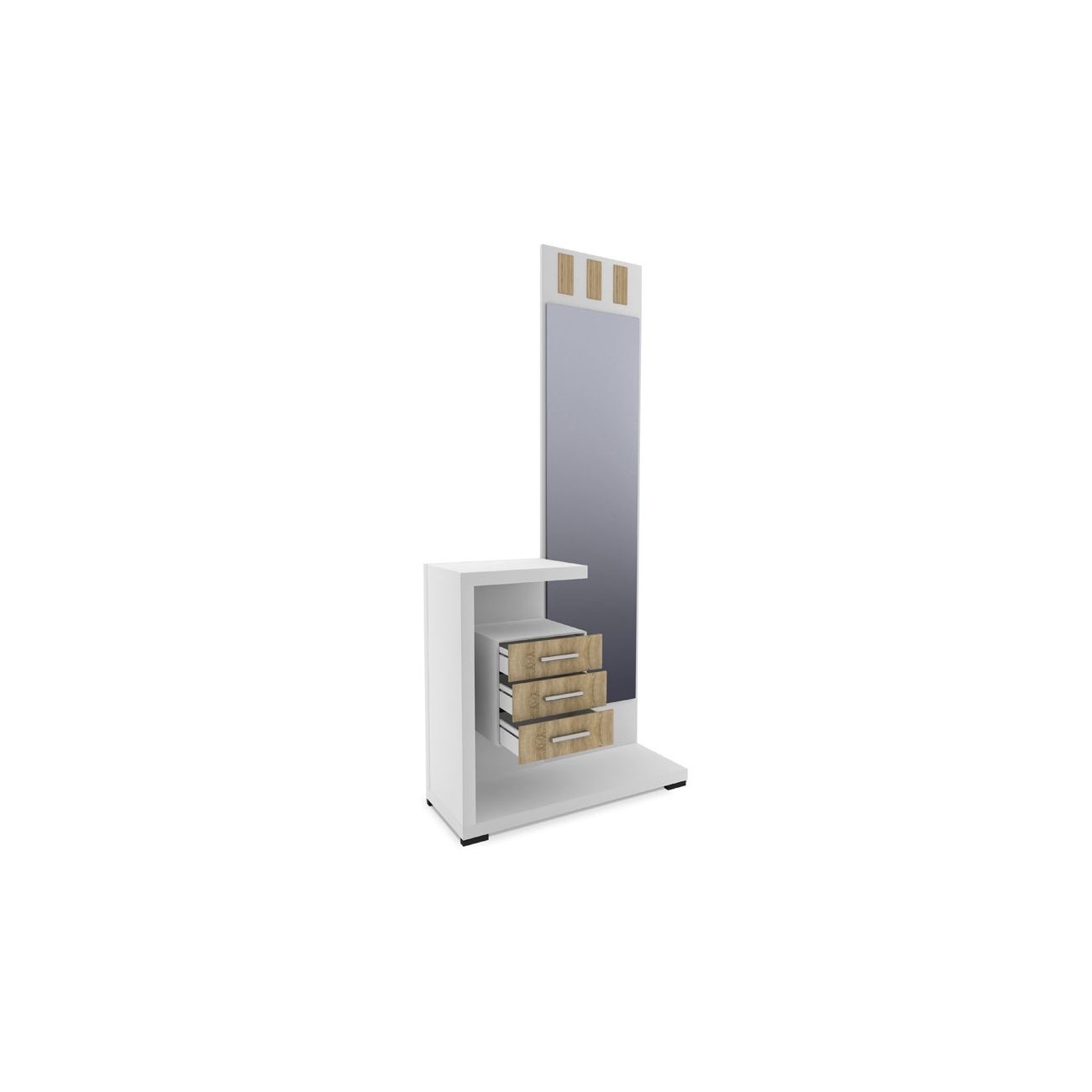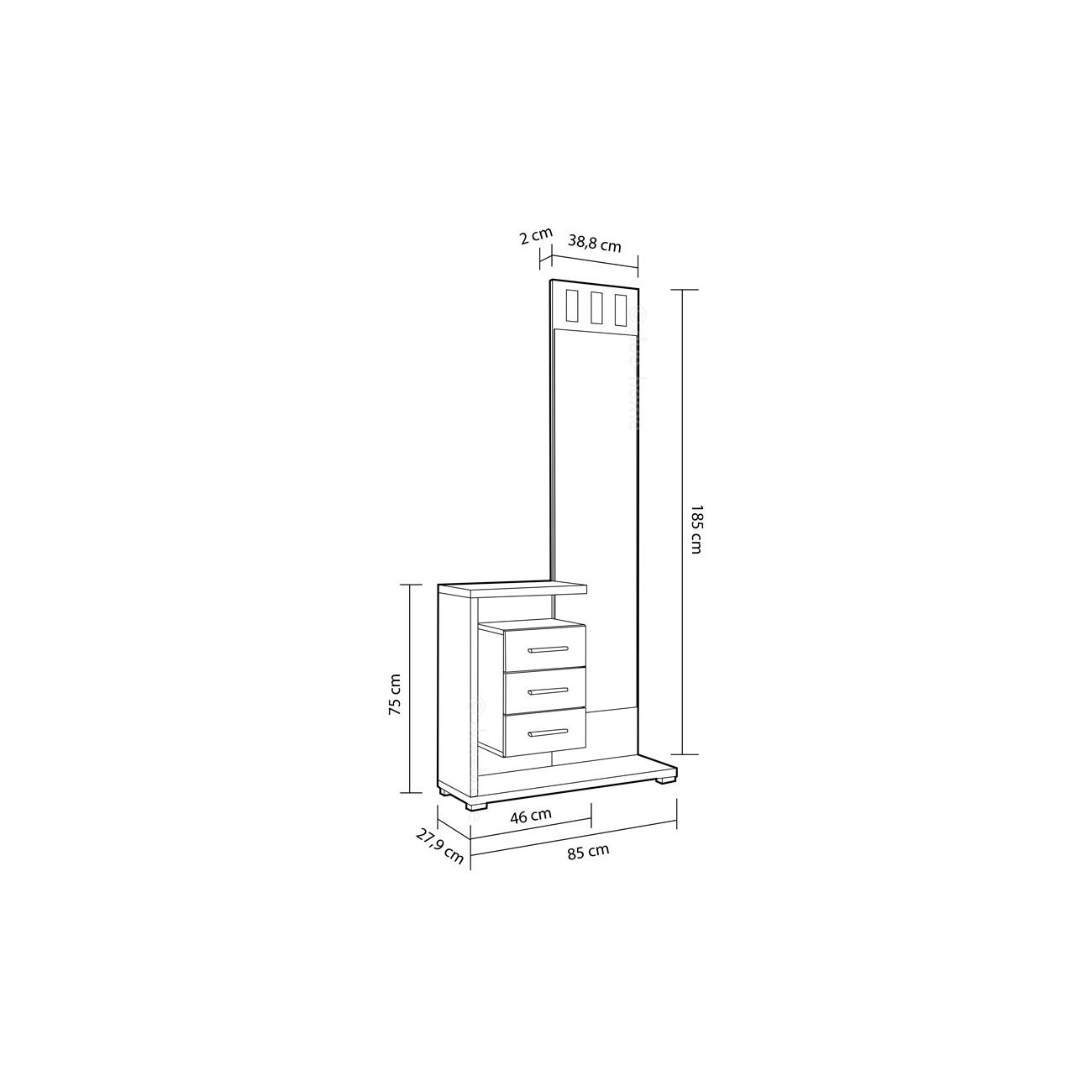 - Este móvel de corredor também lhe oferece um espaço de arrumação generoso graças às suas 3 gavetas e à estrutura que as envolve, e que lhe oferece uma prateleira superior na qual pode colocar o porta-chaves ou um acessório decorativo, e uma prateleira inferior ideal para deixar os sapatos quando entra em casa.