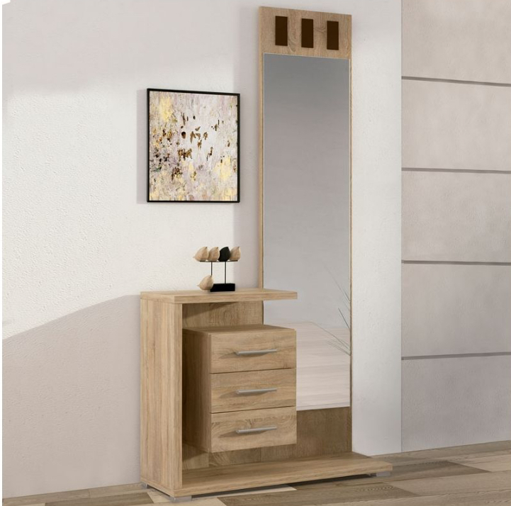 - Este móvel de corredor também lhe oferece um espaço de arrumação generoso graças às suas 3 gavetas e à estrutura que as envolve, e que lhe oferece uma prateleira superior na qual pode colocar o porta-chaves ou um acessório decorativo, e uma prateleira inferior ideal para deixar os sapatos quando entra em casa.