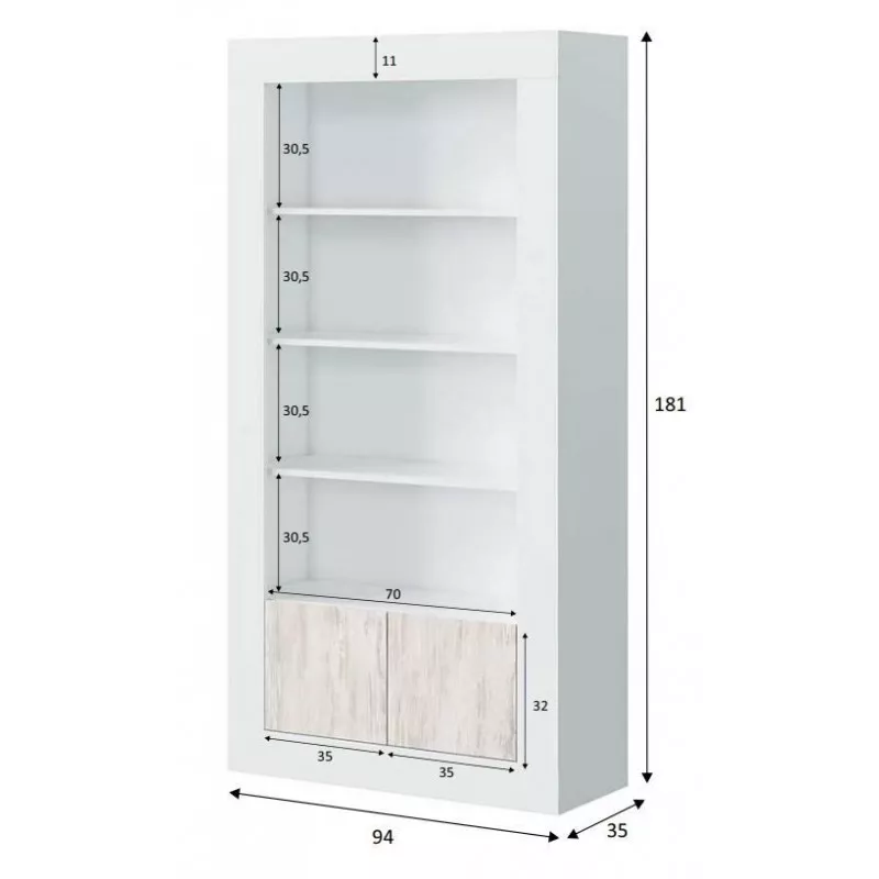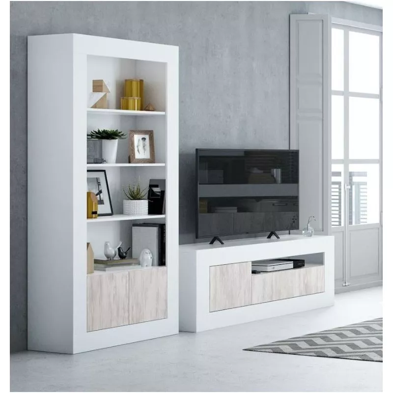 - É composta por 4 prateleiras fixas e 5 compartimentos de arrumação, um deles fechado com duas portas com dobradiças metálicas. É ideal para guardar livros, DVDs, objectos decorativos ou o que quer que queira manter à vista mas bem ordenado na sua sala de estar.