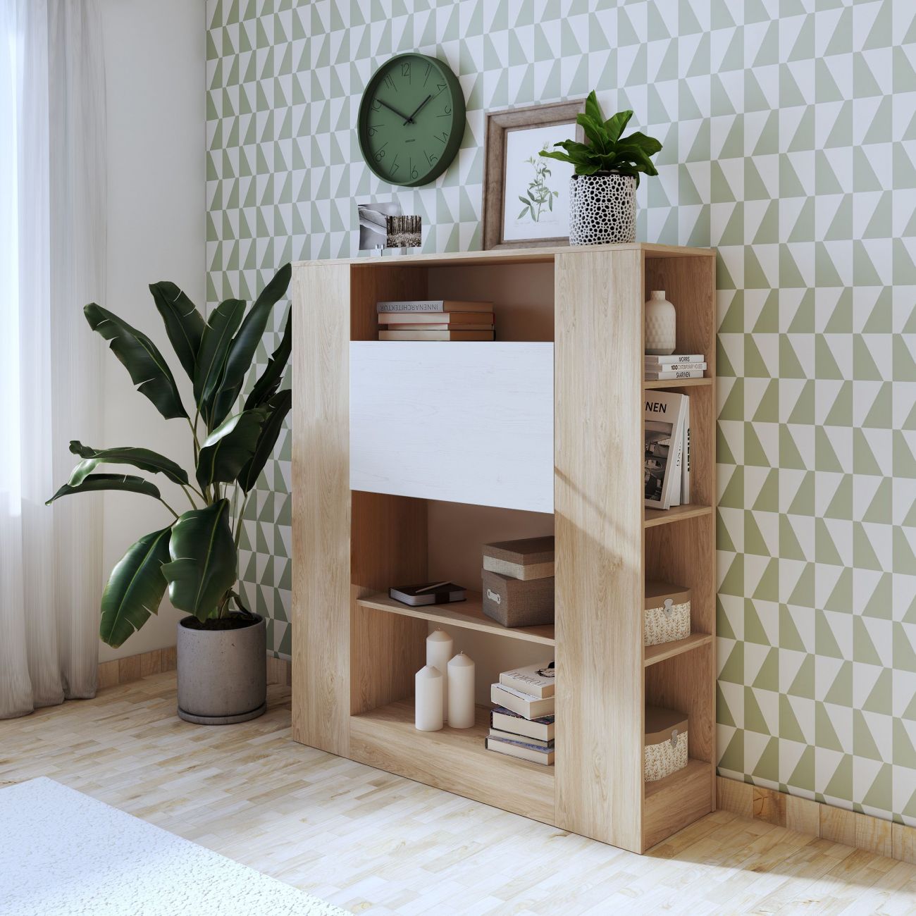 - É uma estante com uma peça dobrável contrastante que se transforma numa prática mesa de estudo ou de trabalho. Com uma altura total de 139,6 cm x 119,6 cm de comprimento x 34,5 cm de profundidade, pode ter duas peças de mobiliário numa só.