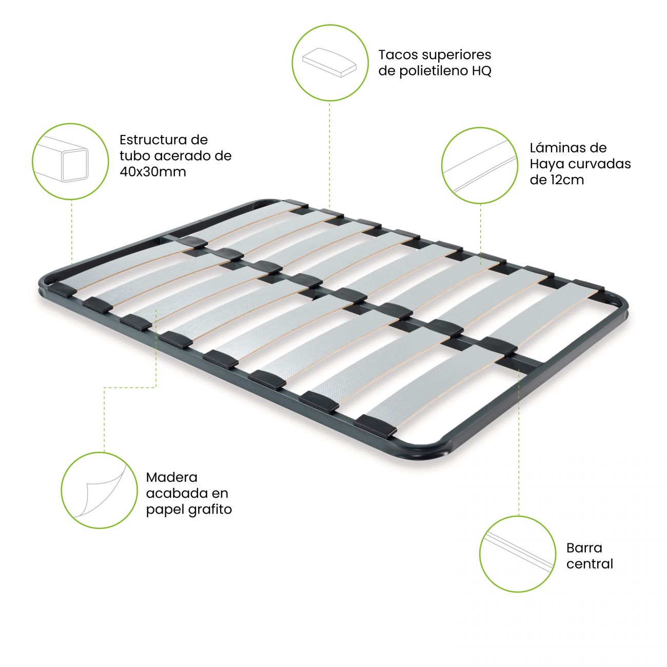 - Cavilhas de polietileno HQ integradas: As cavilhas de polietileno de alta qualidade integradas garantem um ajuste perfeito entre as ripas e a estrutura, minimizando movimentos e ruídos indesejados durante a noite.