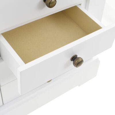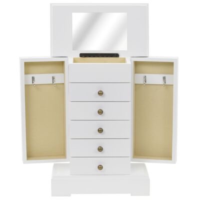 Esta caixa é feita em MDF e possui um espelho envidraçado. Dispõe de um painel que pode ser levantado para revelar um espelho e um pequeno compartimento para joias. Ambos os lados da caixa podem ser abertos e poderá pendurar os seus colares, pulseiras ou adornos de tornozelo nos ganchos. Concebida com 5 gavetas, também oferece muito espaço para os seus cosméticos, produtos capilares e de cuidado da pele. Quando o espelho não está a ser utilizado, a superfície torna-se um local ideal para pequenos artigos.