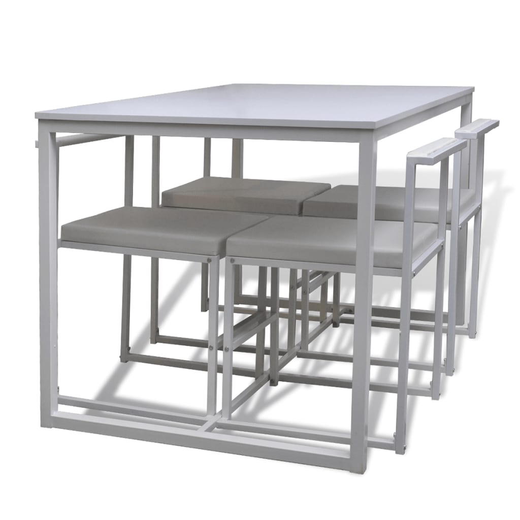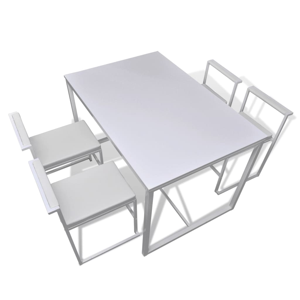 Este conjunto de jantar, composto por 1 mesa e 4 cadeiras, será uma excelente adição à sua sala de jantar ou cozinha. Adicionará um toque de estilo moderno à sua decoração com o seu design simples e elegante.A mesa de jantar é feita de um MDF durável e leve e as suas linhas limpas proporcionam uma aparência elegante. As cadeiras estão estofadas num PVC macio, confortável, acolchoado e de alta qualidade. A mesa e as cadeiras foram construídas com estruturas em ferro, que as tornam robustas e duráveis.