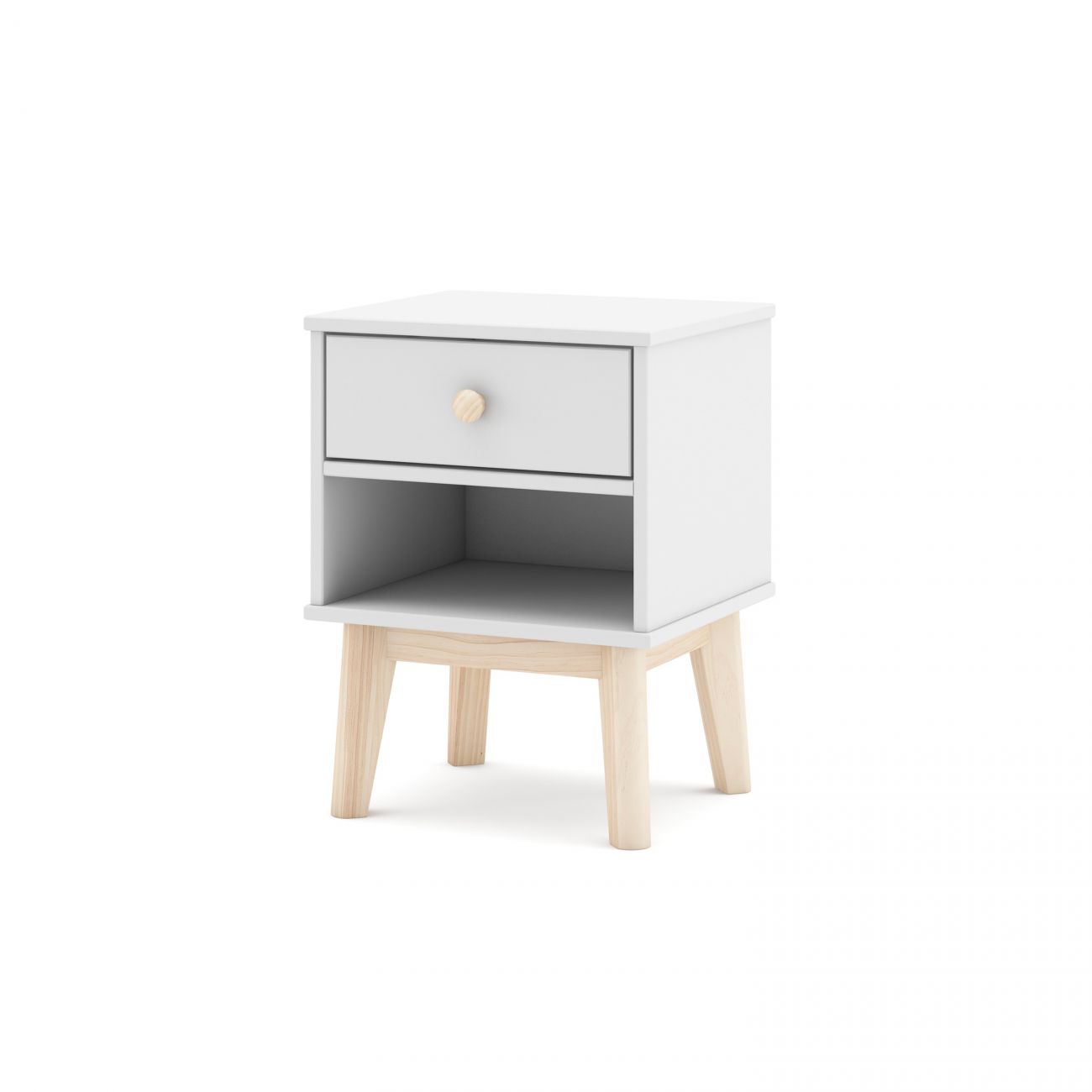 - Este móvel combina a praticidade de uma gaveta superior, ideal para objectos pessoais ou pequenos acessórios, com uma prateleira inferior aberta, perfeita para livros, caixas decorativas ou objectos de uso frequente. A sua estrutura elevada sobre pernas não só melhora a acessibilidade, como também facilita a limpeza do chão e confere leveza visual ao conjunto.