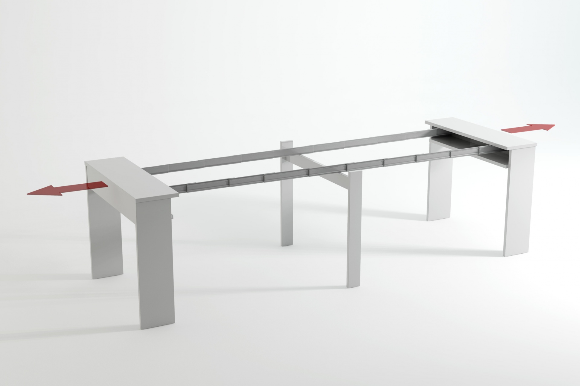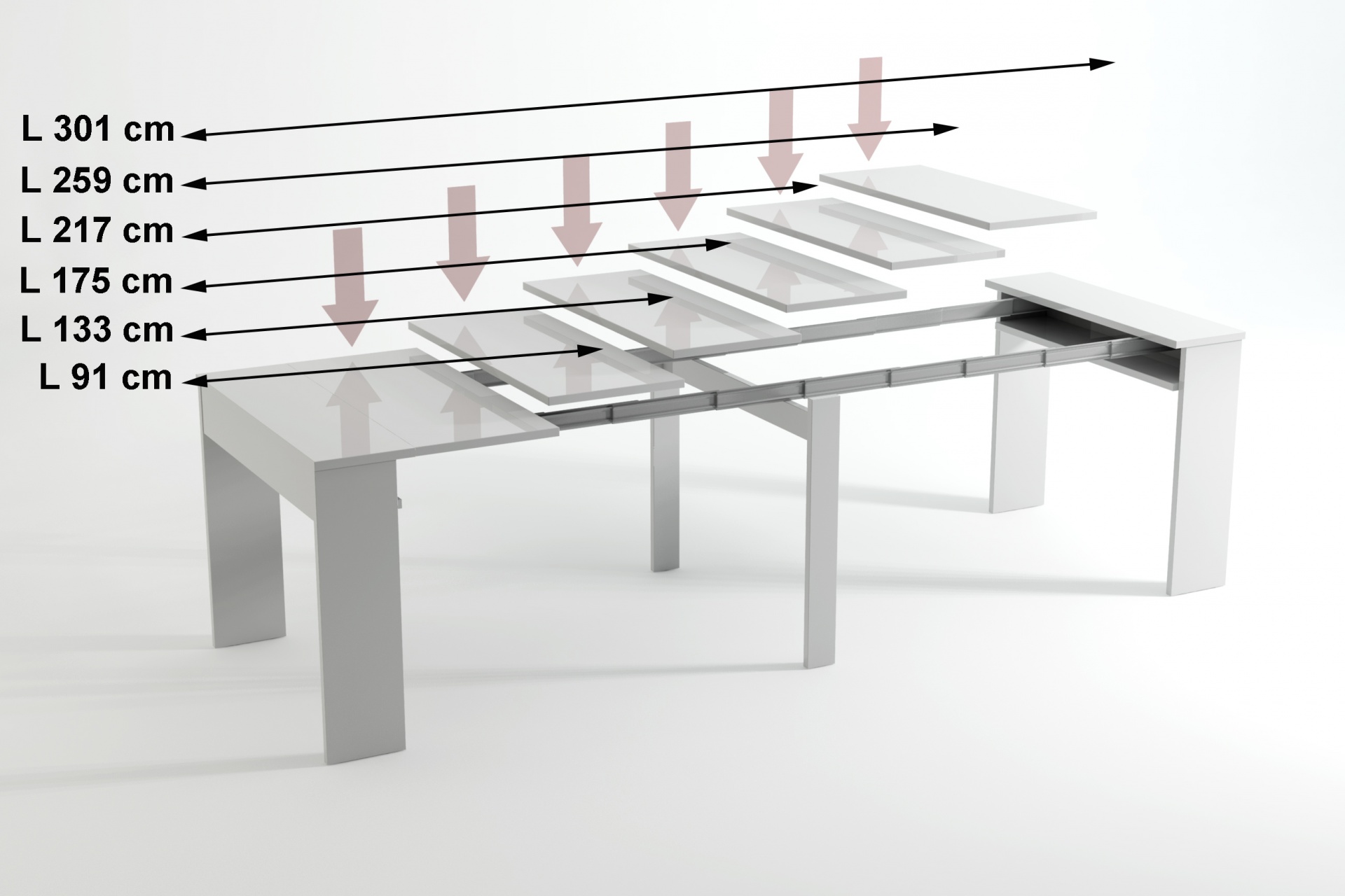 - A mesa de consola Epsilon é feita de aglomerado de alta resistência. Tem até 22 mm de espessura, daí a sua resistência. As guias que permitem a sua transformação são feitas de aço de alta resistência, para que não tenha de se preocupar com o uso contínuo.