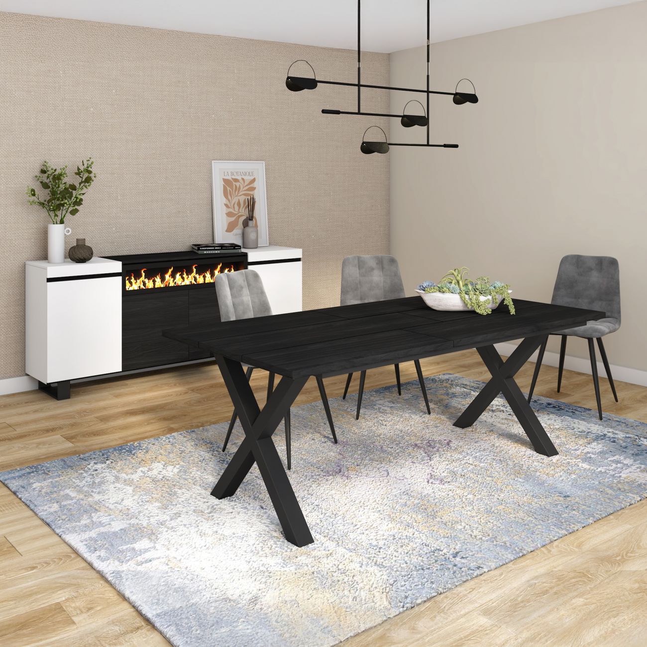 - O grande tampo retangular da mesa é suportado por uma sólida estrutura de pernas em forma de X, proporcionando não só estabilidade e resistência, mas também um forte carácter decorativo. As linhas definidas e a espessura uniforme do tampo da mesa reforçam a presença de uma peça concebida para impressionar e durar.