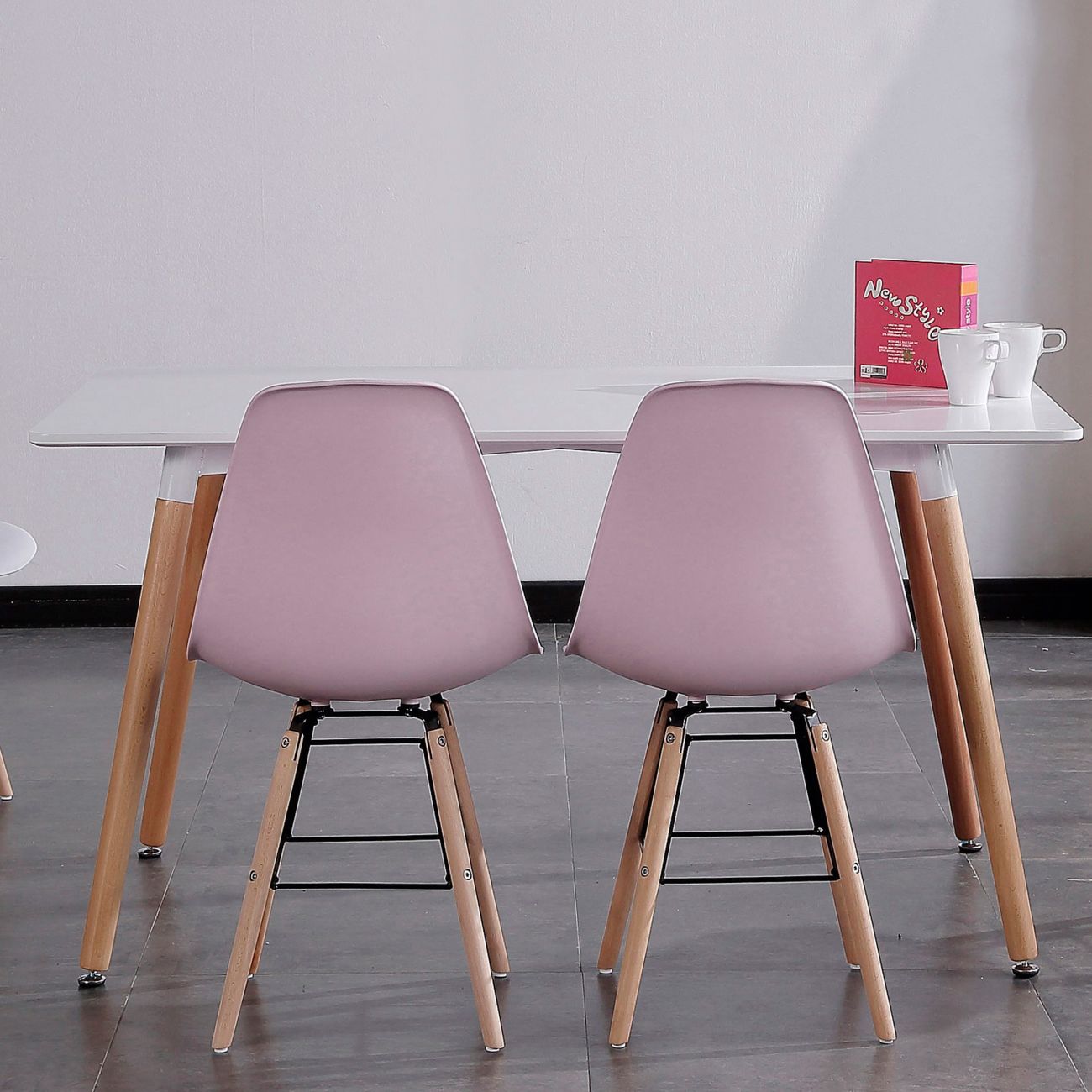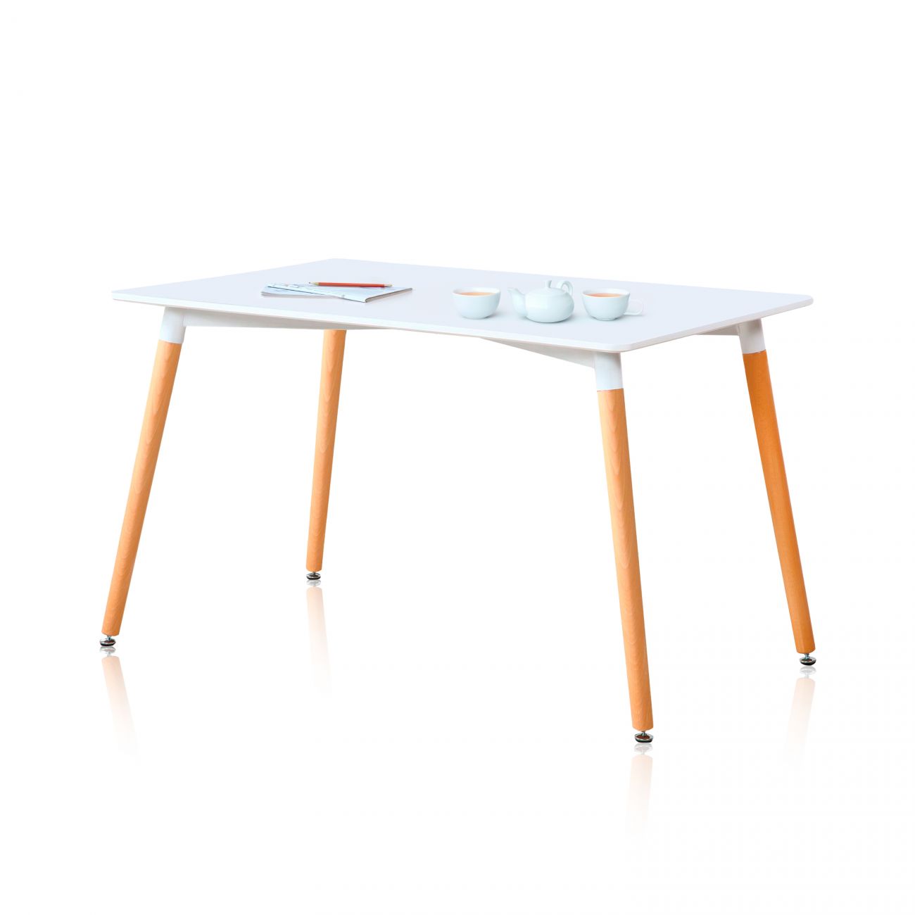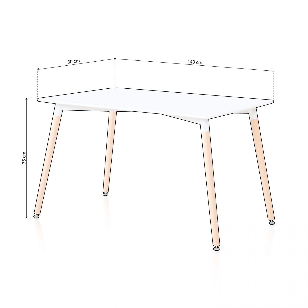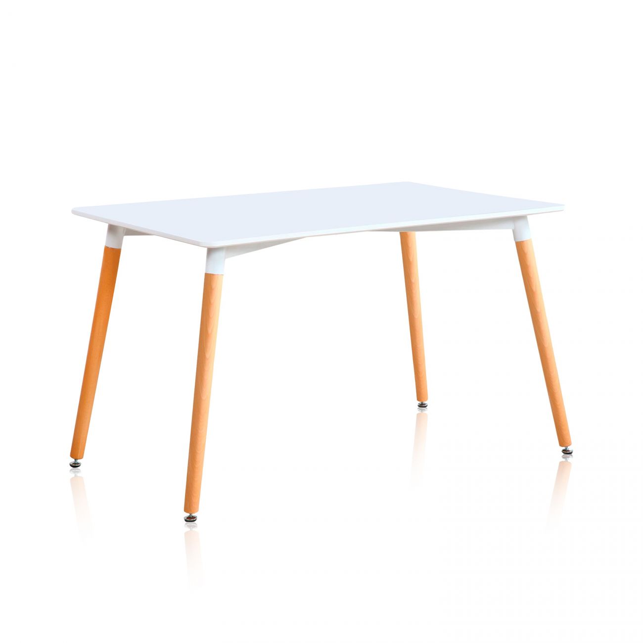 - O tampo da mesa tem um suporte metálico branco reforçado logo abaixo, que o liga às pernas tubulares da mesa, feitas de madeira de faia preciosa e ligeiramente inclinadas para fora, ao mais puro estilo nórdico. O conjunto é muito estável e duradouro.