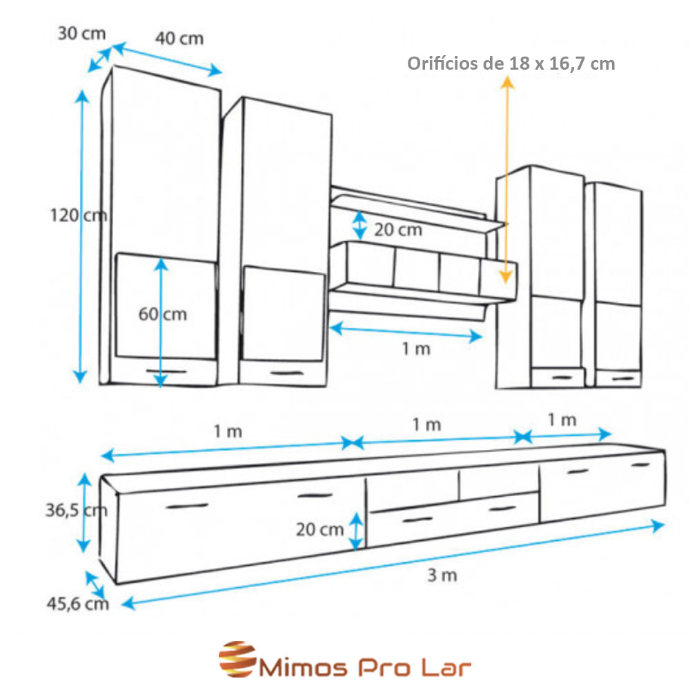 - 3 móveis inferiores de 100 x 36 x 45,6 cm cada