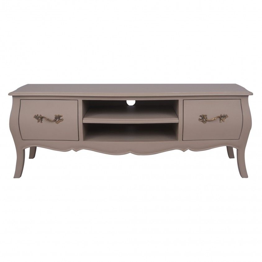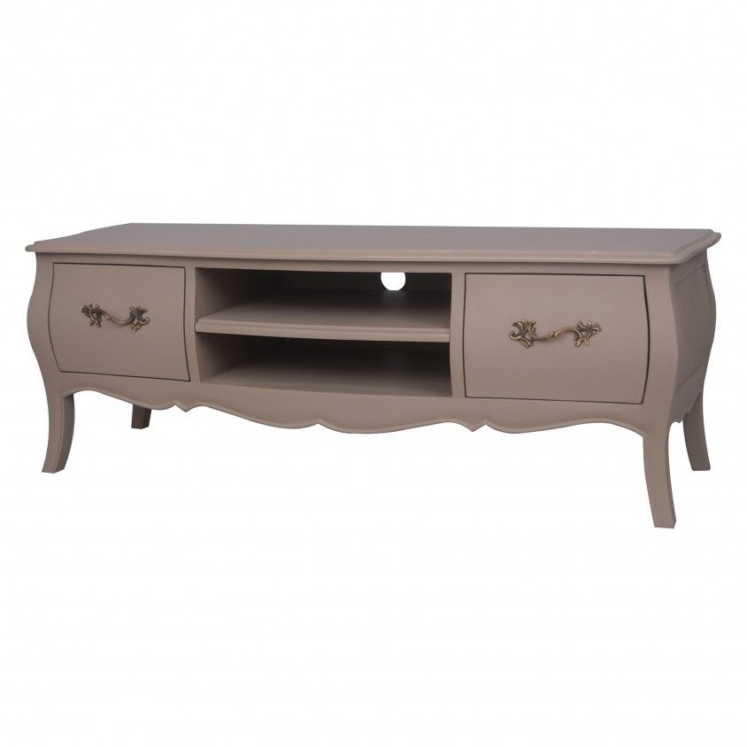 - Móvel de TV com estrutura em madeira de cor taupe.
