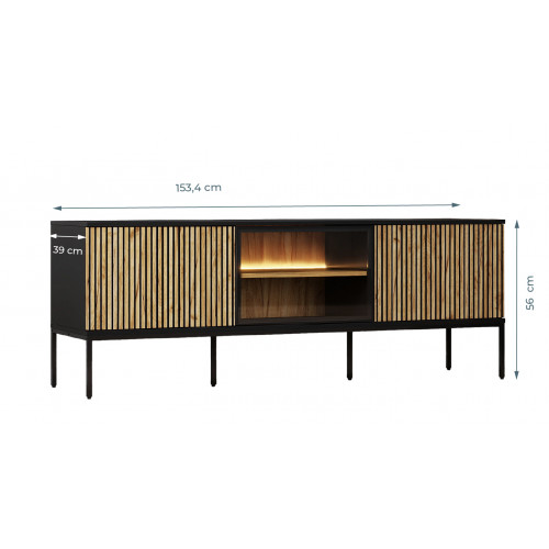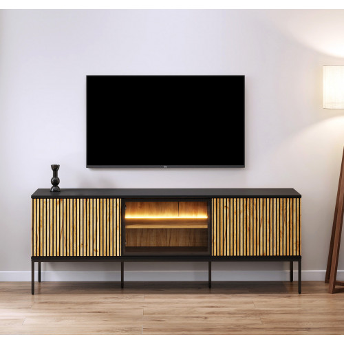 Este elegante suporte para TV se destaca por seu design clean e funcionalidade. Sua estrutura combina materiais modernos com um layout pensado para manter a ordem e a estética. As portas laterais, com acabamento em madeira ranhurada, proporcionam aconchego visual, enquanto a porta central, em vidro temperado transparente, adiciona um toque elegante e leve. No interior, possui amplas prateleiras para guardar dispositivos, livros ou acessórios multimídia. Os pés metálicos elevados permitem a passagem de um robô aspirador de pó, facilitando a limpeza do ambiente. Um suporte para TV versátil que se adapta perfeitamente a salas de estar modernas e minimalistas.
