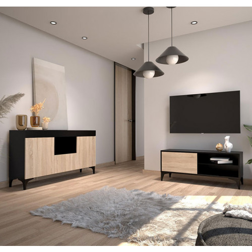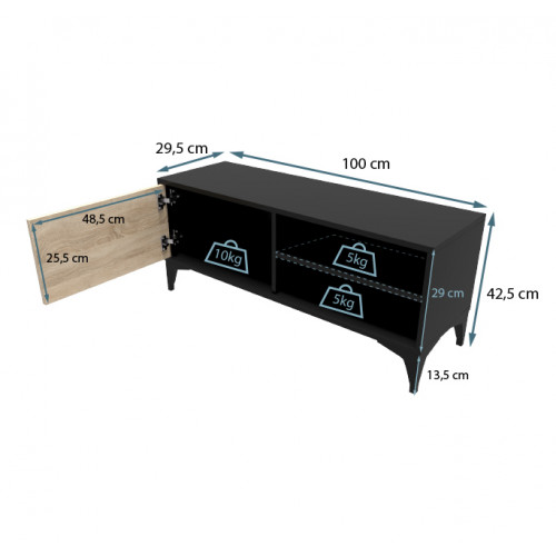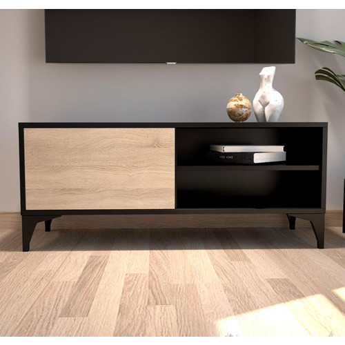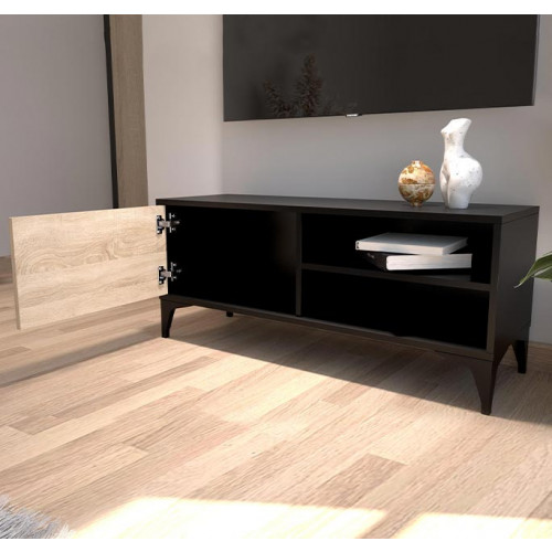 - Apresentamos-lhe um móvel de TV de estilo contemporâneo, perfeito para complementar salas modernas. Possui dois espaços divididos por uma prateleira e uma porta que oferecem armazenamento adicional para seus aparelhos eletrônicos e acessórios.