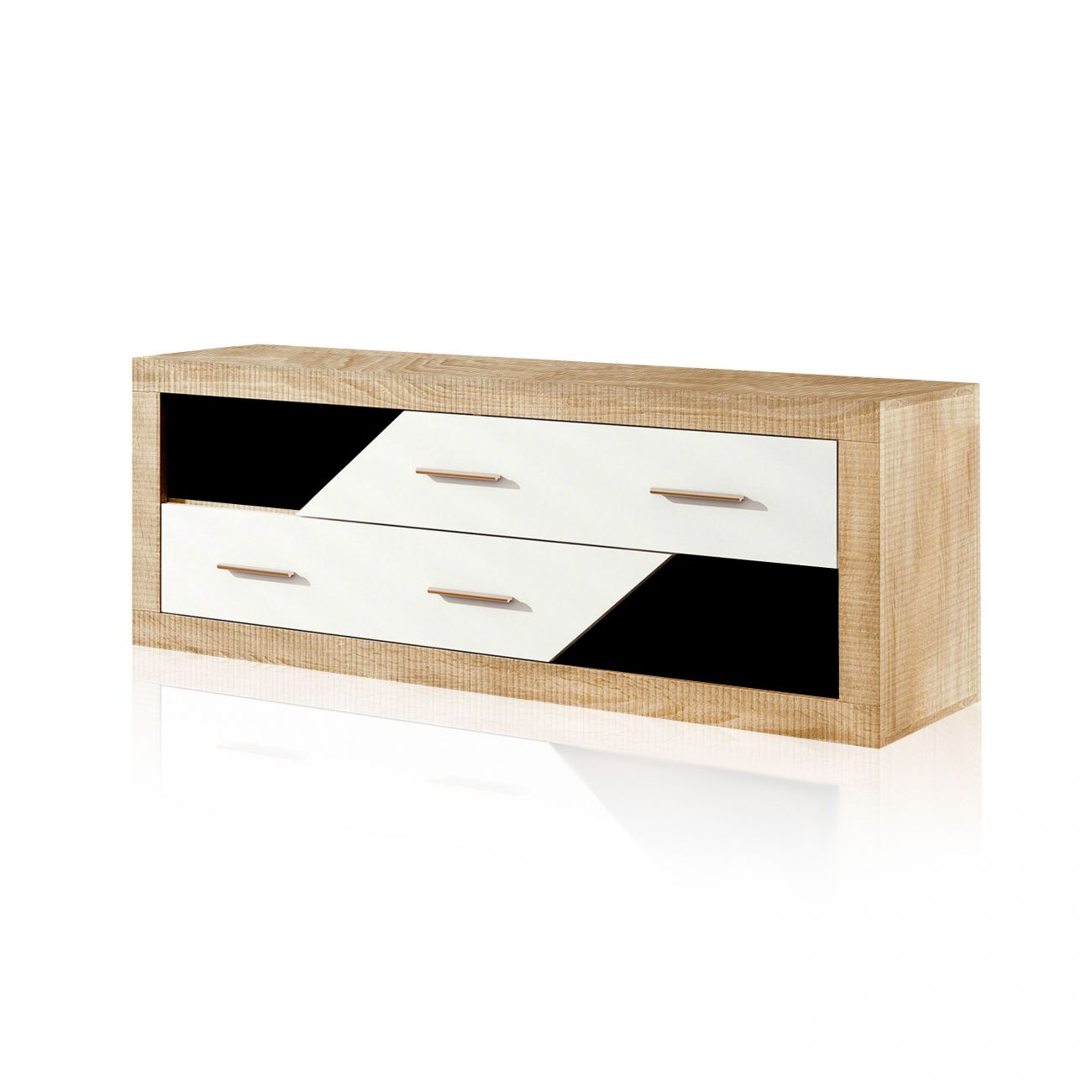 É um móvel com duas gavetas descentradas com corte diagonal e pequenos espaços nas laterais.