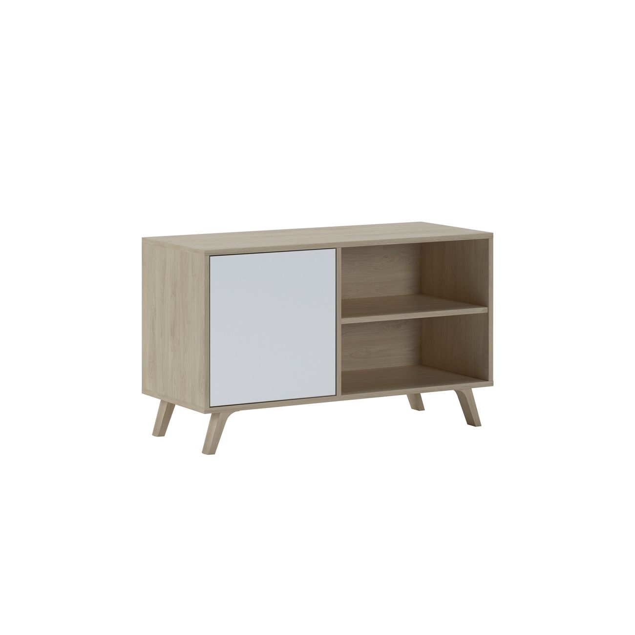 O móvel para televisão é um pequeno móvel para televisão de estilo nórdico com espaço de arrumação fechado e prateleiras expostas para aparelhos electrónicos. Inclui ilhós para cabos e uma perna de reforço central.