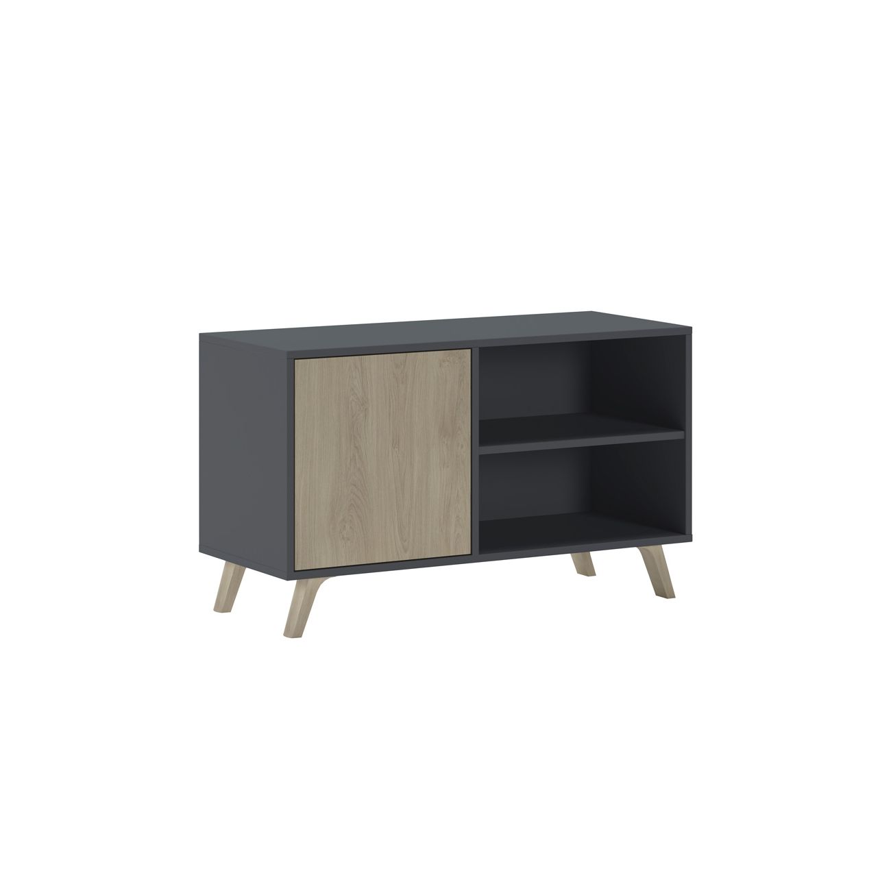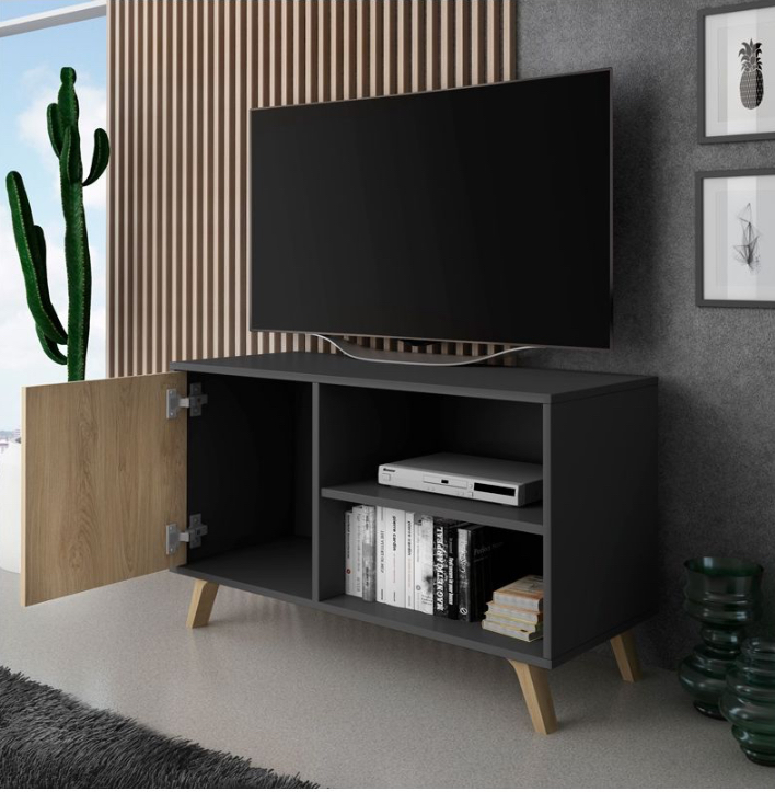 O móvel para televisão é um pequeno móvel para televisão de estilo nórdico com espaço de arrumação fechado e prateleiras expostas para aparelhos electrónicos. Inclui ilhós para cabos e uma perna de reforço central.
