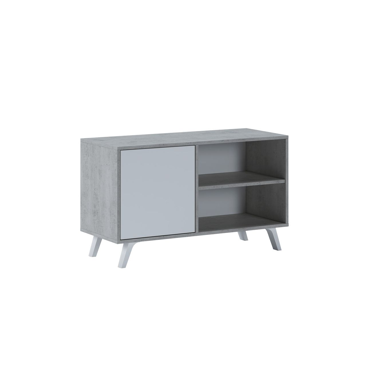 O móvel para televisão é um pequeno móvel para televisão de estilo nórdico com espaço de arrumação fechado e prateleiras expostas para aparelhos electrónicos. Inclui ilhós para cabos e uma perna de reforço central.