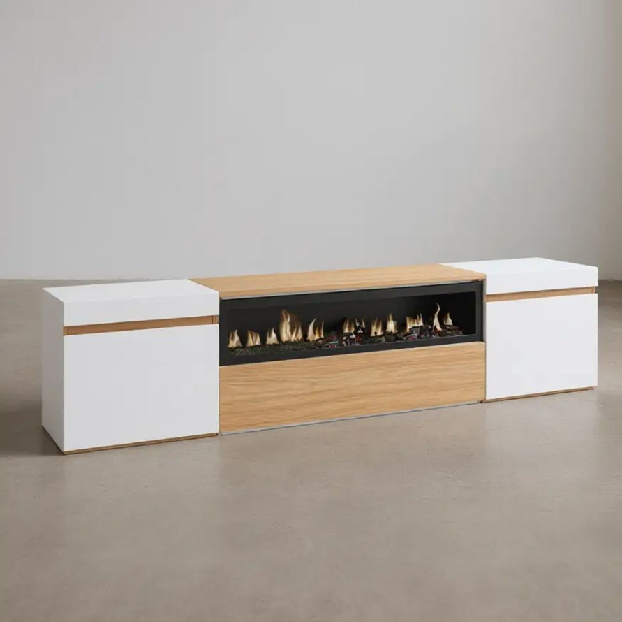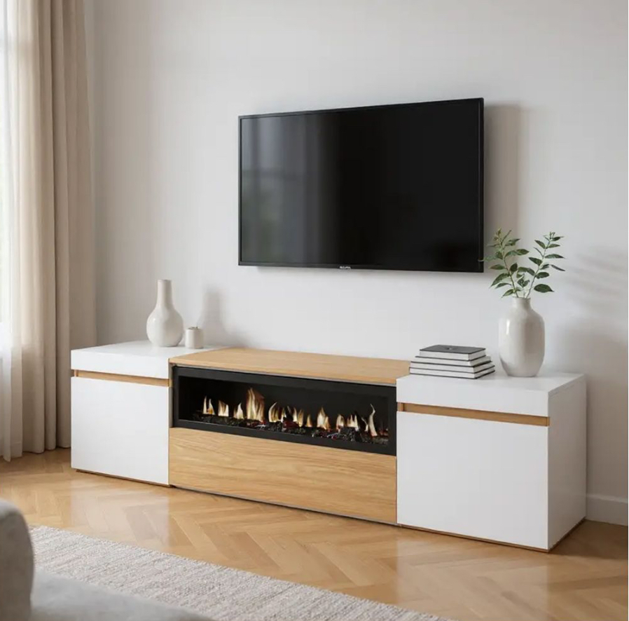 - Seu design de linhas retas, sem pés ou fixação na parede, permite uma integração harmoniosa em qualquer sala de estar, criando um ambiente aconchegante, equilibrado e elegante. É a solução ideal para quem procura um móvel baixo para TV com lareira decorativa e valoriza tanto a estética quanto a funcionalidade.