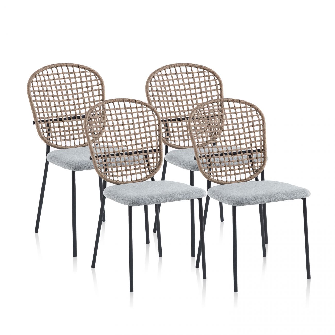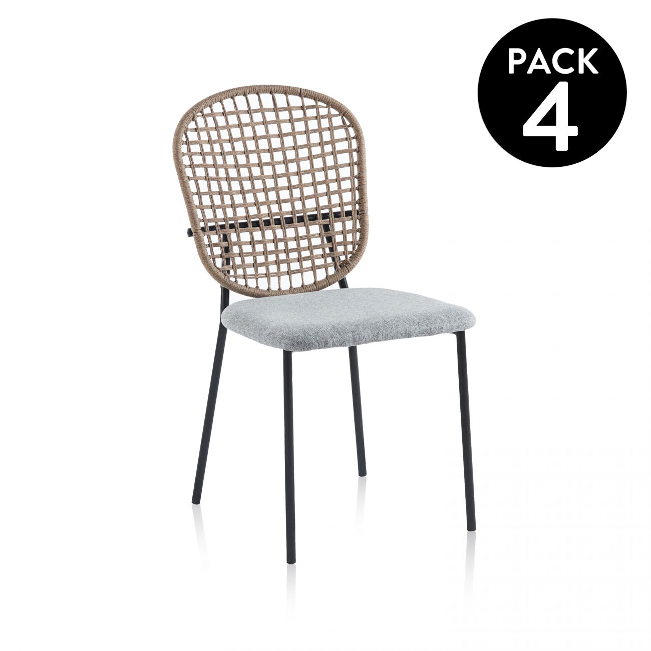 A cadeira de jantar Sting é uma cadeira que se adquire em packs indivisíveis de 4 unidades. Composta por uma estrutura metálica preta com o assento tapizado em tecido cinzento e o encosto entrançado em corda castanha. Adapta-se perfeitamente a móveis de estilo moderno ou retro.