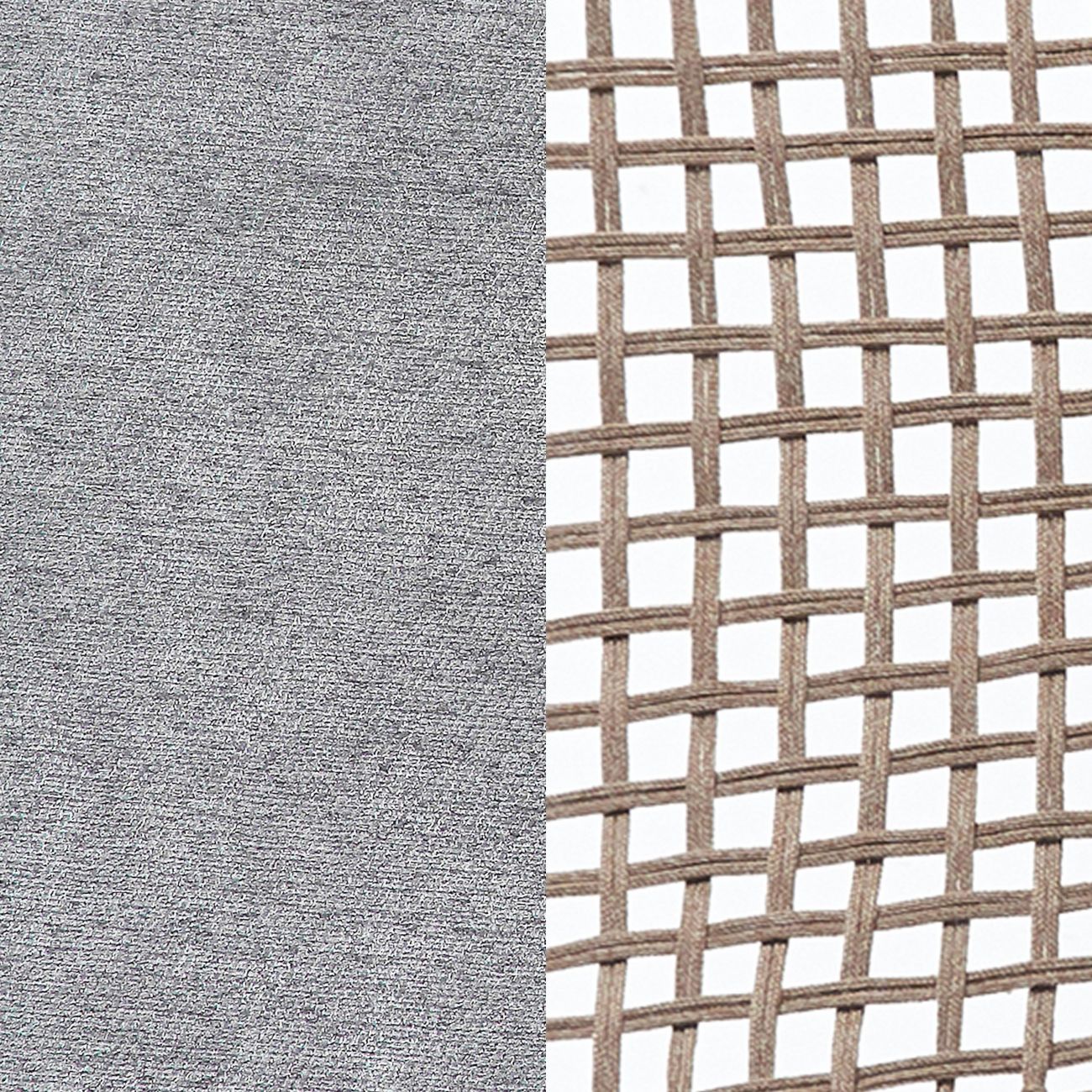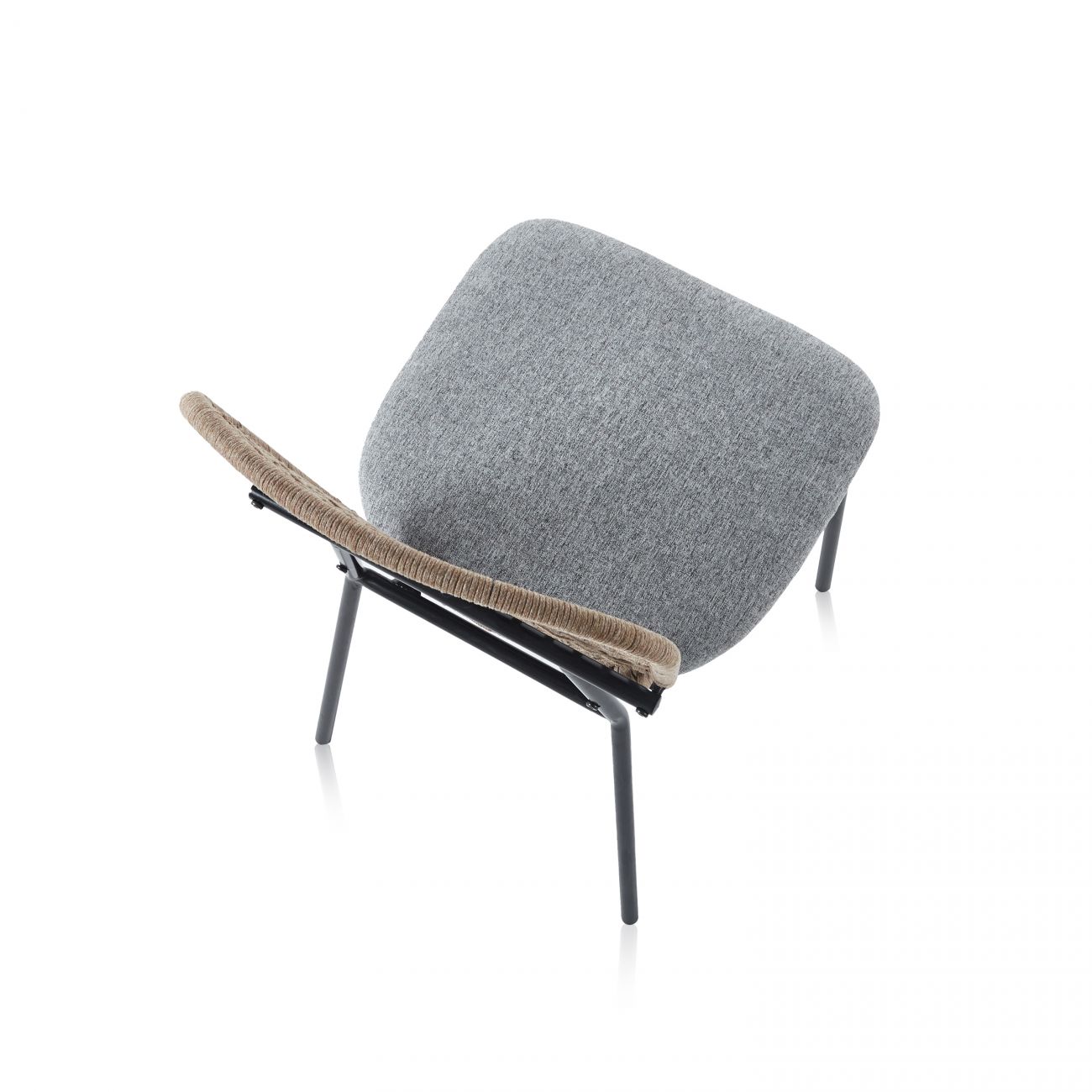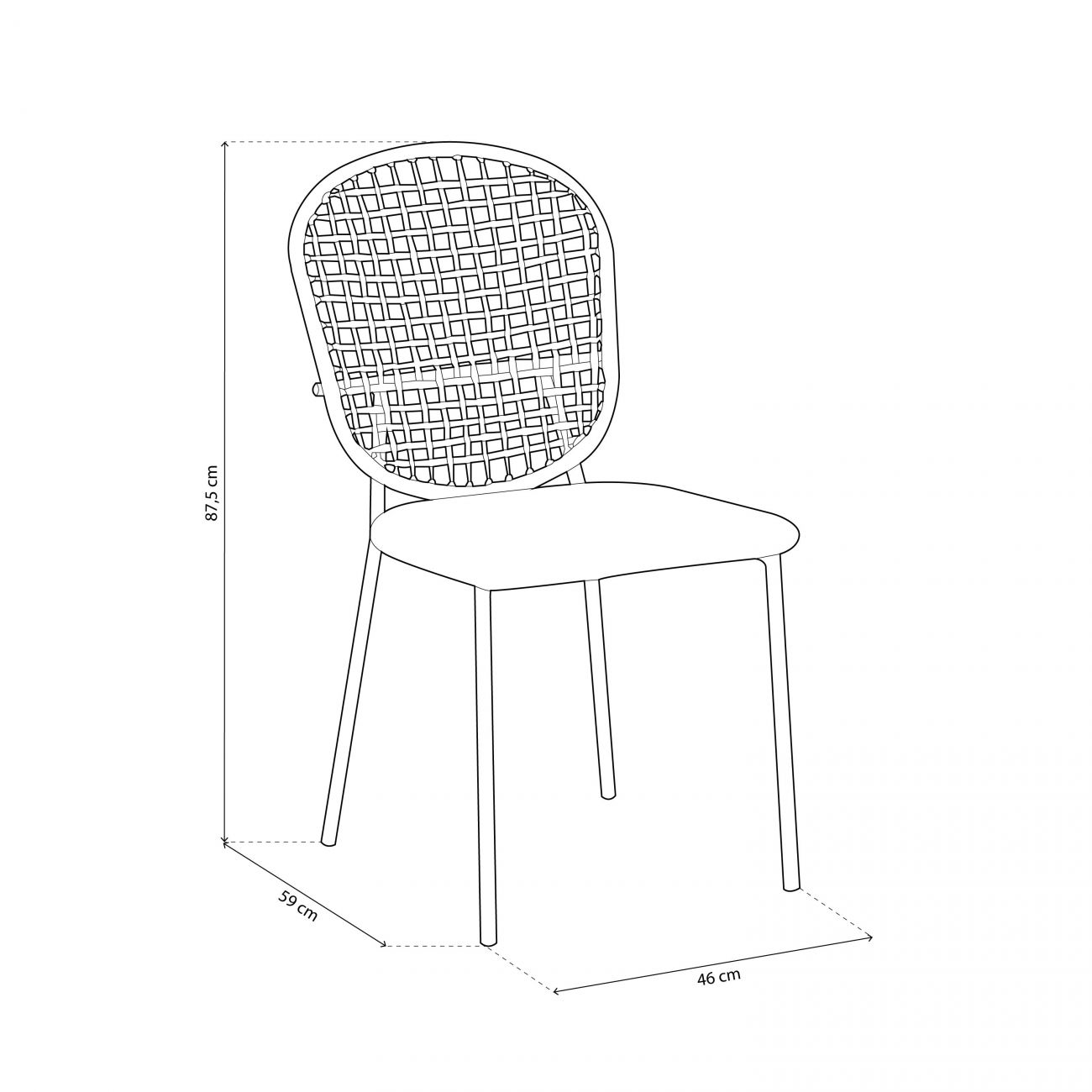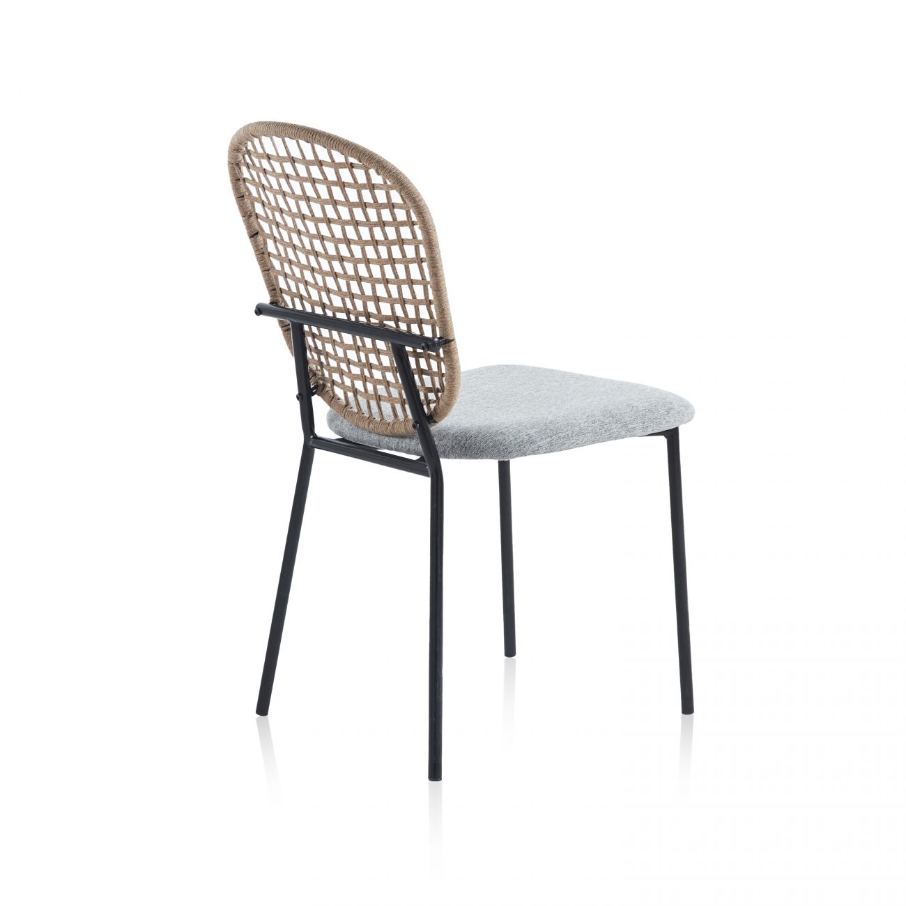 - É fabricada com uma estrutura metálica principal combinada com a cor cinzenta do estofo do assento e com o encosto entrançado em corda castanha. O encosto entrançado proporciona muito conforto e comodidade porque se adapta às costas, ao mesmo tempo que se destaca pelos múltiplos tecidos e cores que o compõem. Tem uma altura total de 87,5 cm x 59 cm de largura x 46 cm de comprimento. Além disso, não sobrecarrega visualmente o espaço devido à respirabilidade do encosto.