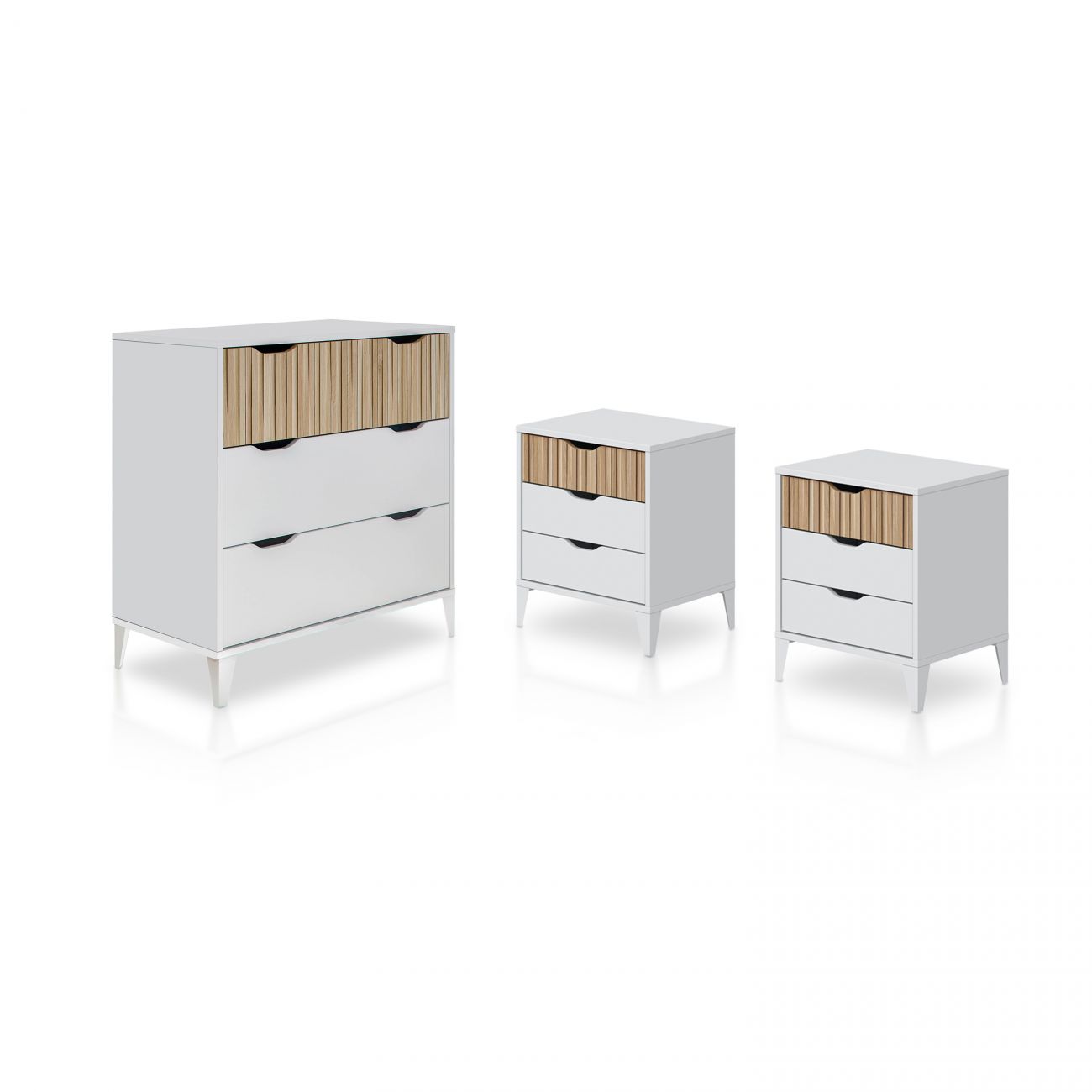 - Cada peça do conjunto destaca-se pelo seu design moderno de linhas simples, combinando painéis lisos com pormenores de efeito ripado na parte superior das gavetas, conferindo dinamismo e textura ao conjunto sem sobrecarregar o espaço. Os acabamentos de alta qualidade realçam a estrutura, oferecendo um aspeto polido e resistente que se adapta a diferentes estilos de decoração.