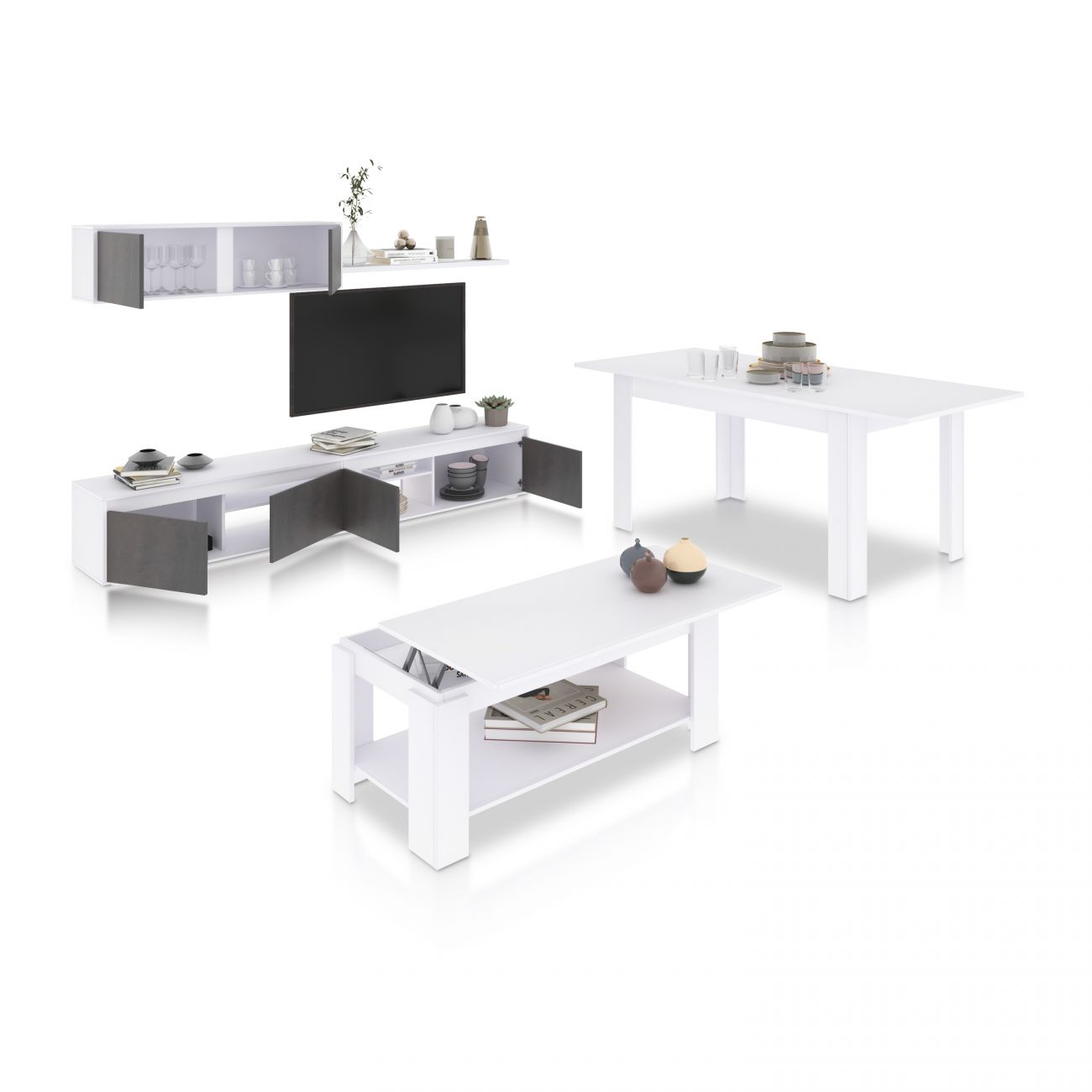 - Pack completo de sala de estar composto por um móvel de TV, um móvel superior, um móvel de prateleiras, uma mesa de centro e uma mesa extensível